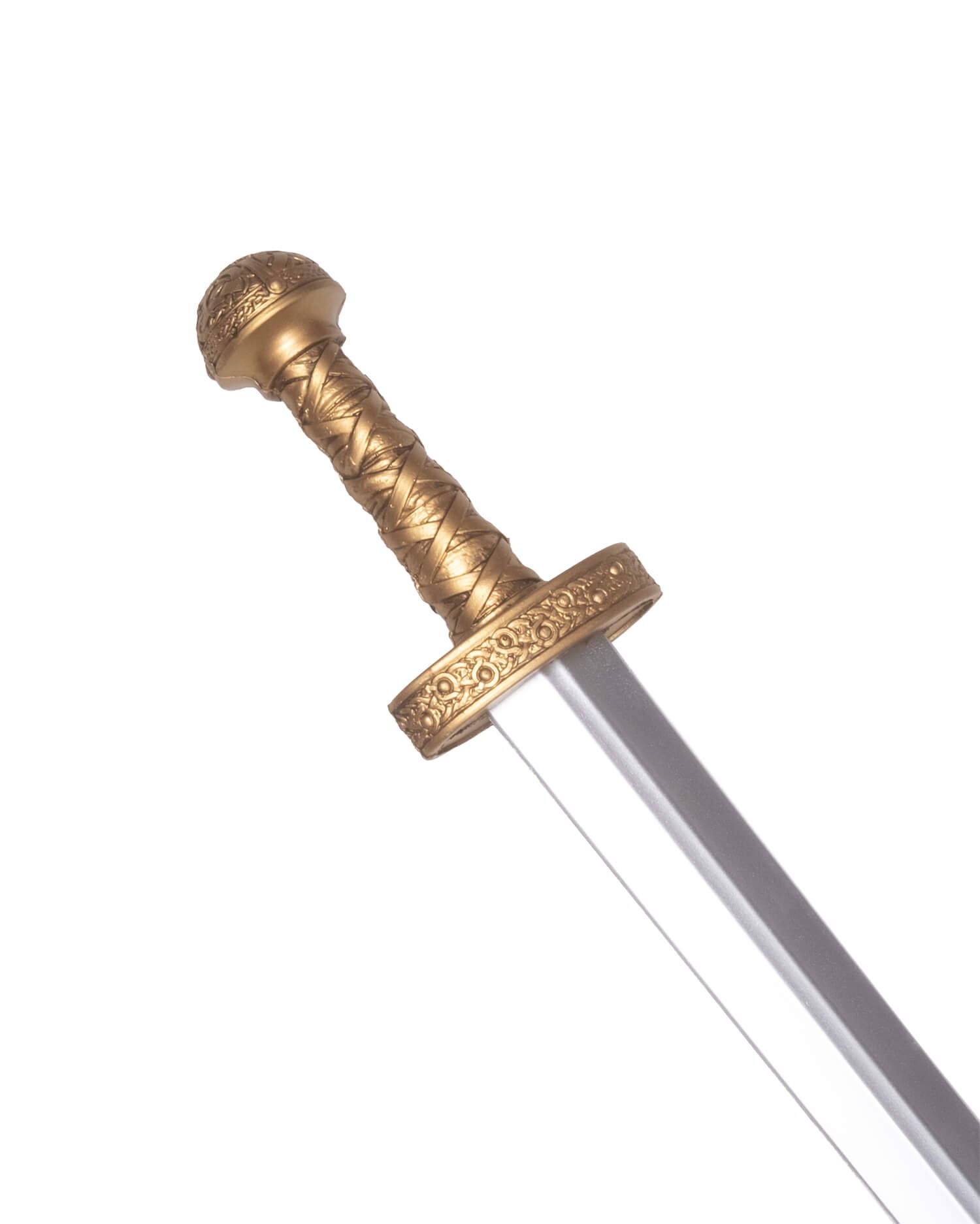 Descubre la espada corta perfecta para tus aventuras de LARP con un diseño único y atractivo. Este arma de espuma compacta cuenta con una hoja delgada y un empuñadura decorada que destaca por su estilo nórdico, con un acabado dorado que le otorga un carácter histórico y representativo.