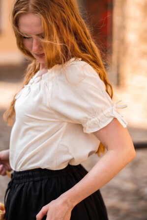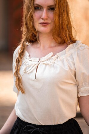 Descubre nuestra blusa medieval de manga corta Otilia, diseñada especialmente para aquellos que buscan un toque de historia y elegancia. Con mangas cortas y un escote ajustable que puedes llevar sobre los hombros, esta blusa se convierte en una pieza versátil para tu vestuario. El diseño incluye cordones tanto en el escote como en las mangas, lo que permite personalizar el ajuste y crear un efecto ligeramente abombado. Las pequeñas aberturas laterales en el dobladillo añaden un detalle sutil pero significativo, mientras que su silueta holgada ofrece una apariencia relajada.