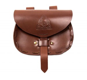 Su diseño cuenta con una solapa redondeada adornada con un elegante grabado celta, asegurada mediante una correa que se ajusta a través de un lazo y se cierra con remaches metálicos. Las costuras visibles y las cuerdas decorativas a lo largo de sus contornos realzan su estilo único, mientras que las dos trabillas traseras permiten fijar la bolsa a cinturones de hasta 5 cm de ancho.