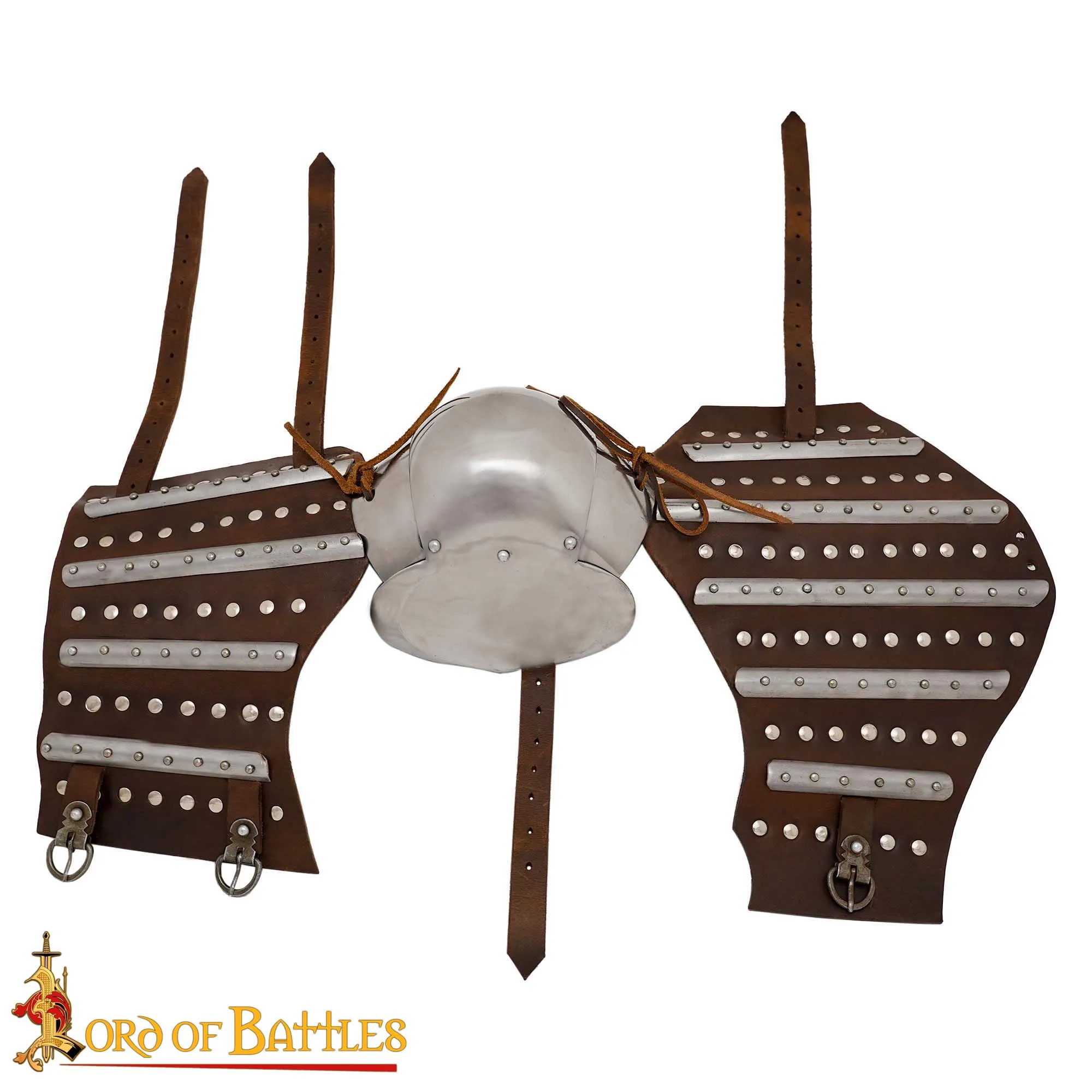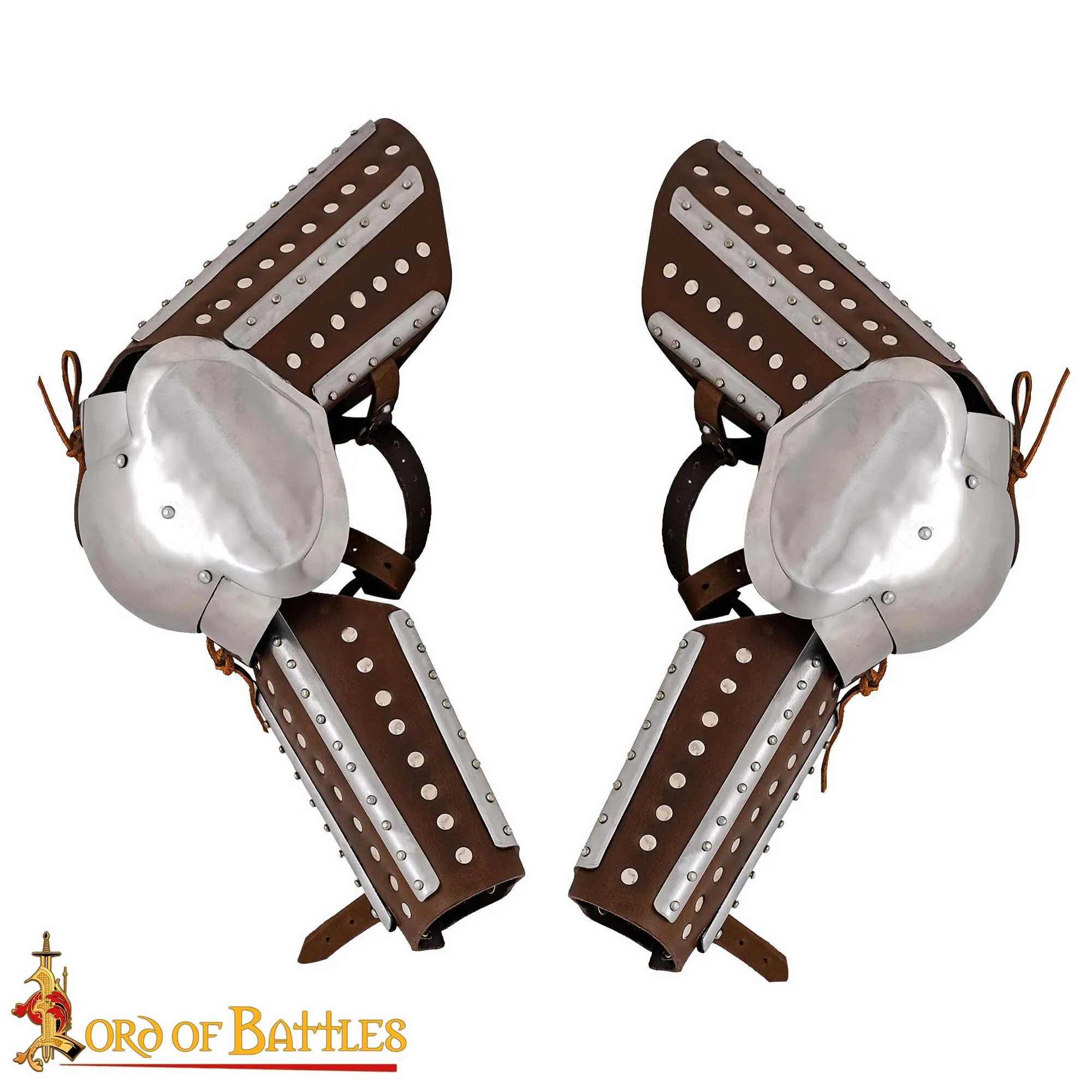 DescripciónHISTORIALos brazos y las manos eran las herramientas más importantes de un caballero. Su fuerza y ??resistencia eran necesarias cuando las armas pesadas debían transportarse durante horas en la batalla o en un torneo. Al mismo tiempo, los brazos podrían sufrir daños en combate ya que un golpe que no alcanza su objetivo a menudo golpeaba los brazos. E incluso uno podía autolesionarse involuntariamente, por ello tener los brazos desprotegidos posibilitaba sufrir lesiones graves y dejar al caballero incapacitado e indefenso.Hasta principios de la Edad Media, la protección de los brazos recibió poca atención. Los primeros modelos consistían en partes metálicas individuales que estaban unidas a correas atadas alrededor del antebrazo. Hacía finales de la Edad Media las protecciones utilizan más piezas elementos que se extienden desde la muñeca, sobre el codo, hasta aproximadamente la mitad de la parte superior del brazo. Visualmente y en su efecto protector, tales brazales completos forman una unidad en conjunción con los hombros, incluso con guantes de malla o guanteletes completos.Para su personaje de LARP o participar en una recreación medieval los brazales suponen una pieza ideal con la que complementar su vestuario y armadura.Los productos de metal requieren de unos cuidados para su correcto mantenimiento. La norma más importante es evitar todo lo posible la humedad (agua, sudor, salinidad, etc.). Almacenarla en un lugar seco y revisarlo cada varias semanas para detectar signos de oxidación. Si encuentra alguno, retíralo frotando el lugar afectado con un estropajo impregnado con aceite antioxidante.Si la pieza se moja, es importante que la seque completamente tan pronto como sea posible.Después de manipular, usar o tras de varios meses de almacenamiento o exhibición, todo el metal debe limpiarse con un paño limpio. Recomendamos lubricar ligeramente la superficie limpia conSpray Ballistol(aceite lubricante y antioxidante).Siguiendo estos consejos, cada vez que asistas a un Rol en Vivo (LARP) tu armadura lucirá limpia y resplandeciente.