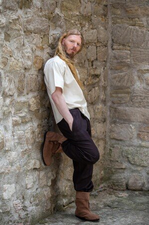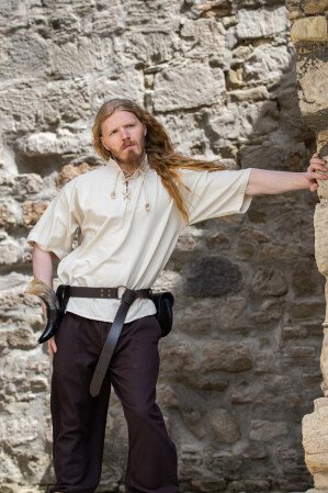 Sumérgete en el pasado con nuestra camisa medieval de manga corta Eric, diseñada para transportarte a la época épica de los caballeros y vikingos. Este diseño único presenta un corte recto y cómodo que garantiza libertad de movimiento en cualquier aventura. Su cuello alto redondeado cuenta con un elegante cierre de cordones adornados con cuentas de madera, añadiendo un toque rústico y auténtico. Las mangas amplias caen justo por encima del codo, mientras que el dobladillo recto llega hasta la altura de la cadera, ofreciendo una estética simple pero poderosa que te acompañará en cada paso.