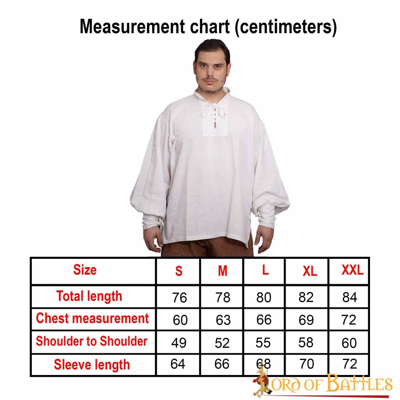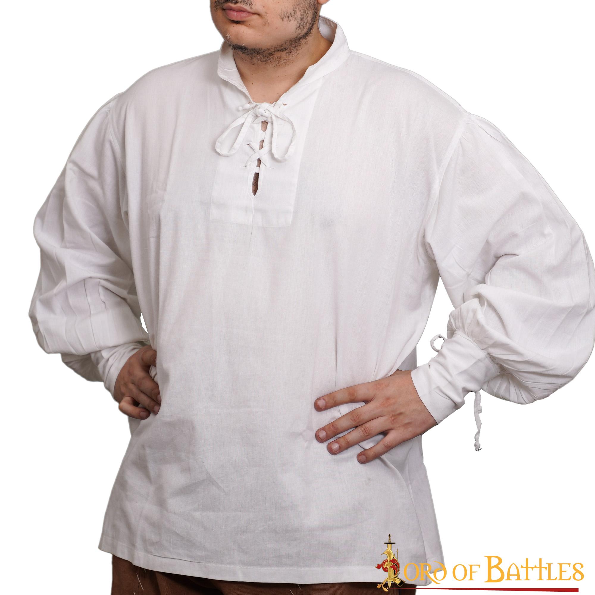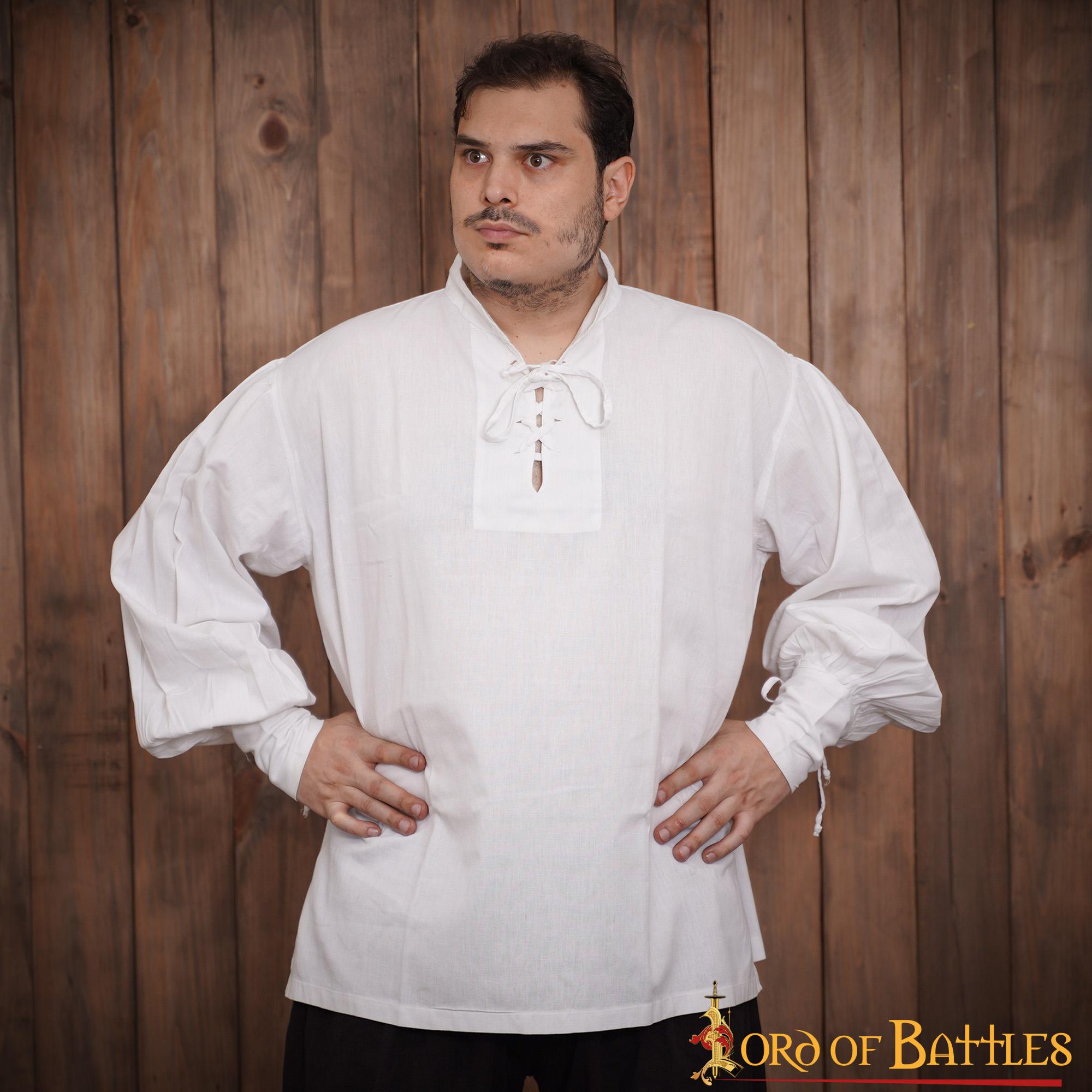 Disponible en color blanco, tallas S a XXL, es una elección versátil para quienes buscan una camisa pirata bordada de algodón perfecta para rol en vivo, recreación histórica o ambientaciones medievales.