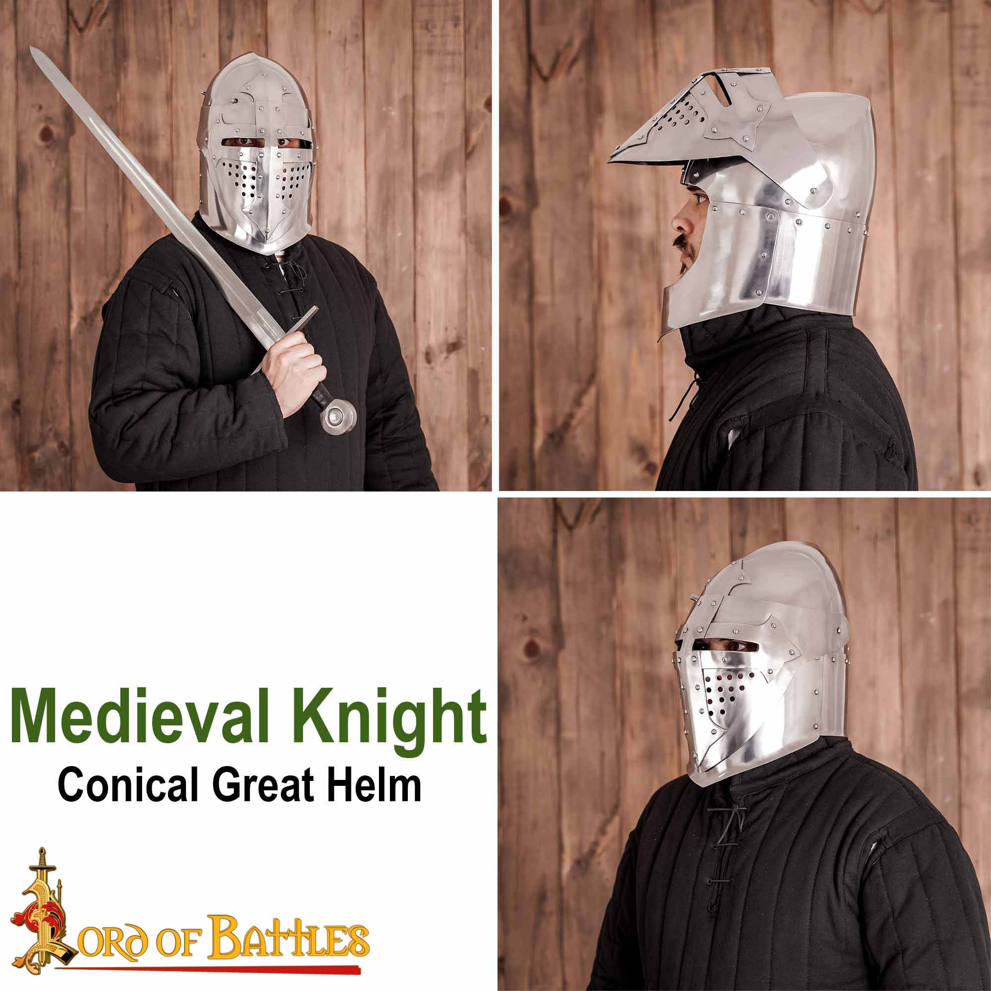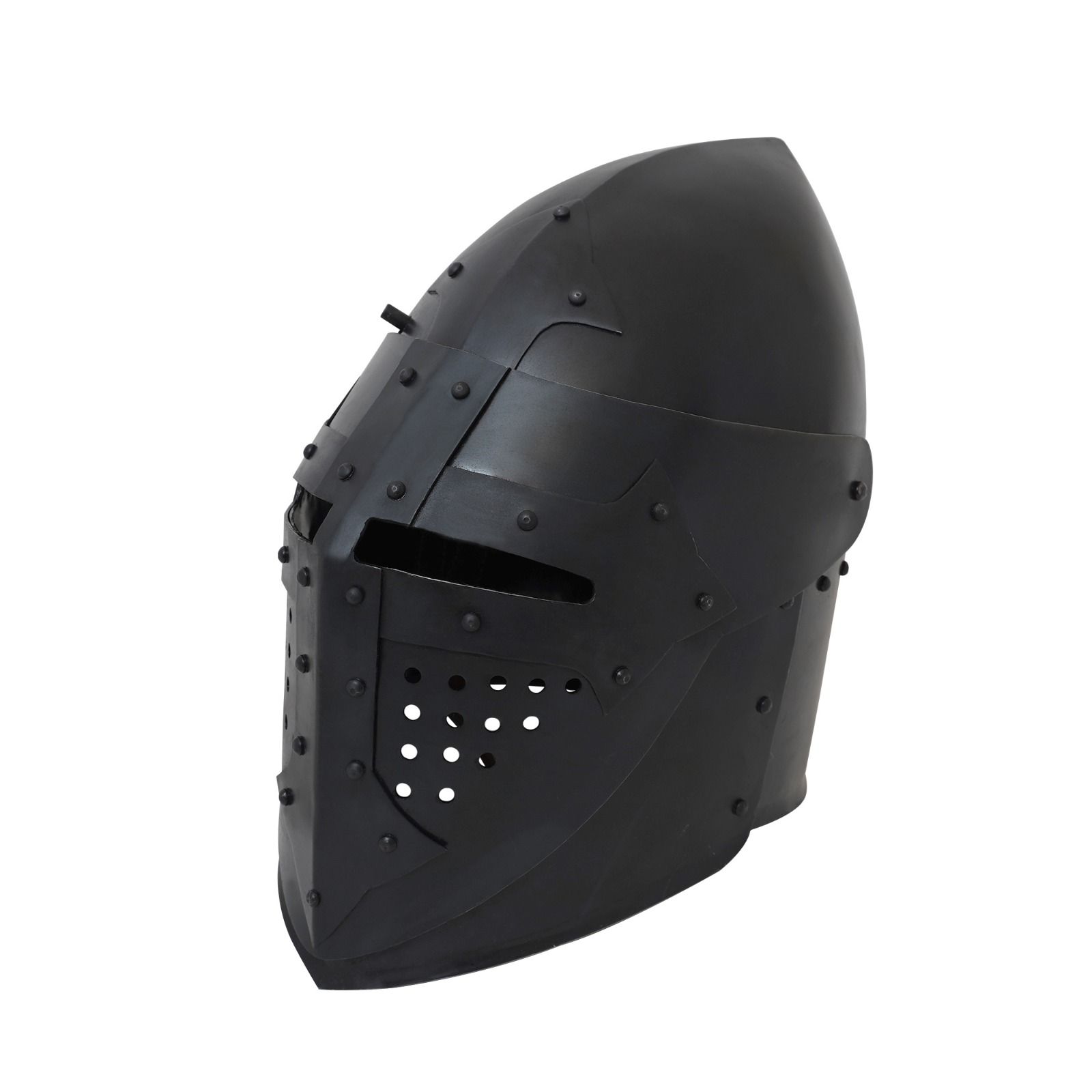 DescripciónHISTORIAImagina a un caballero completamente acorazado cargando contra su oponente con un gran yelmo de estilo antiguo, listo para golpear con toda su fuerza. Ahora, imagina a ese mismo caballero con un bacinete con visera: ¡un casco aún mejor y más versátil! Nuestra reproducción se inspira directamente en el famoso relieve del Palacio del Bargello de Florencia y en un ejemplo similar hallado en un manuscrito francésen el año 1370-80.Lo llevaban los caballeros con armadura completa y contaba con una visera abatible para ofrecer mayor versatilidad al caballero, que ahora podía refrescarse y beber simplemente abriendo la visera, lo que era imposible con el anticuado gran yelmo. Nuestra reproducción es ideal para recreaciones de caballeros con armadura completa del siglo XIV.Los productos de metal requieren de unos cuidados para su correcto mantenimiento. La norma más importante es evitar todo lo posible la humedad (agua, sudor, salinidad, etc.). Almacenarla en un lugar seco y revisarlo cada varias semanas para detectar signos de oxidación. Si encuentra alguno, retírelo frotando el lugar afectado con un estropajo suave impregnado con aceite antioxidante. Si la pieza se moja, es importante que la seque completamente tan pronto como sea posible. Después de manipular, usar o después de varios meses de almacenamiento o exhibición, todo el metal debe limpiarse con un paño limpio. Recomendamos lubricar ligeramente la superficie limpia conSpray Ballistol(aceite lubricante y antioxidante). Siguiendo estos consejos, cada vez que asistas a un Rol en Vivo(LARP) tu armadura lucirá limpia y resplandeciente.