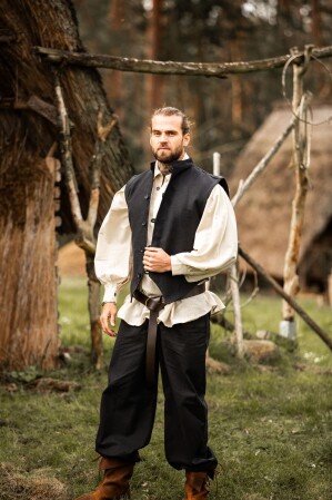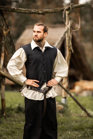 Nuestro chaleco está inspirado en la moda funcional de la Edad Media, cuando las prendas eran valoradas tanto por su utilidad como por su apariencia. Los chalecos como este eran populares entre quienes buscaban libertad de movimiento sin sacrificar el estilo. En ese entonces, se utilizaban para protegerse del frío mientras se mantenía una apariencia distinguida.