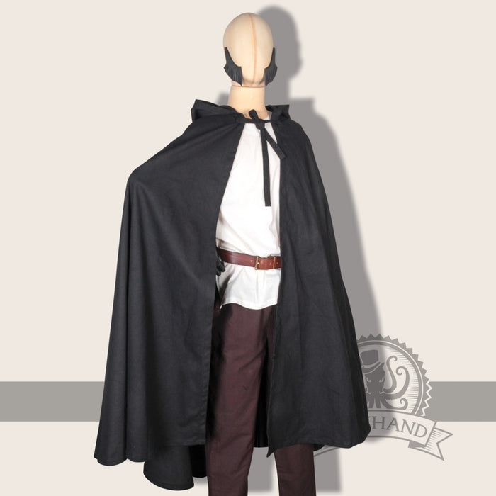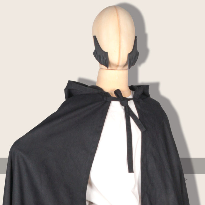 La capa medieval se cierra en la parte delantera con dos cintas, asegurando un ajuste cómodo.