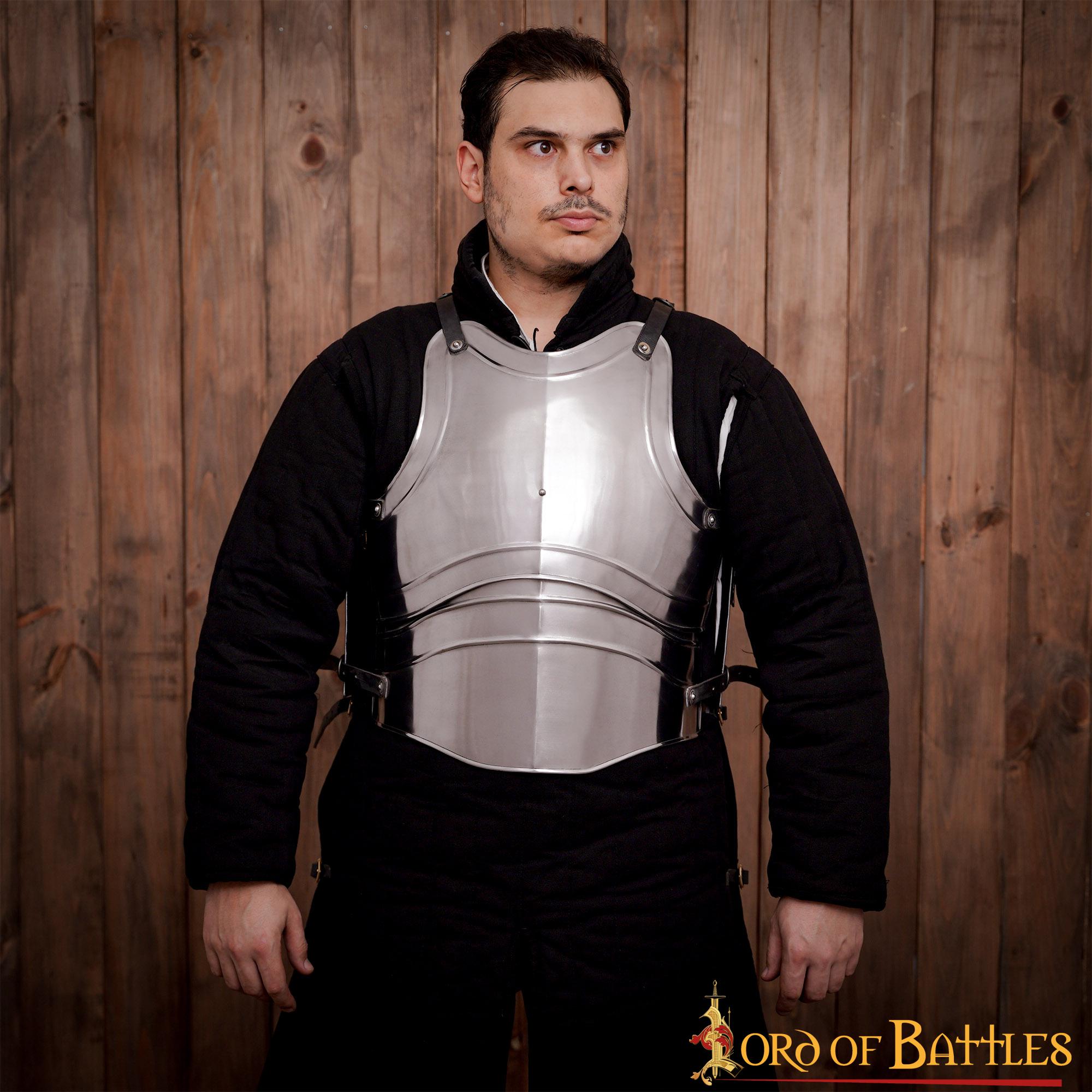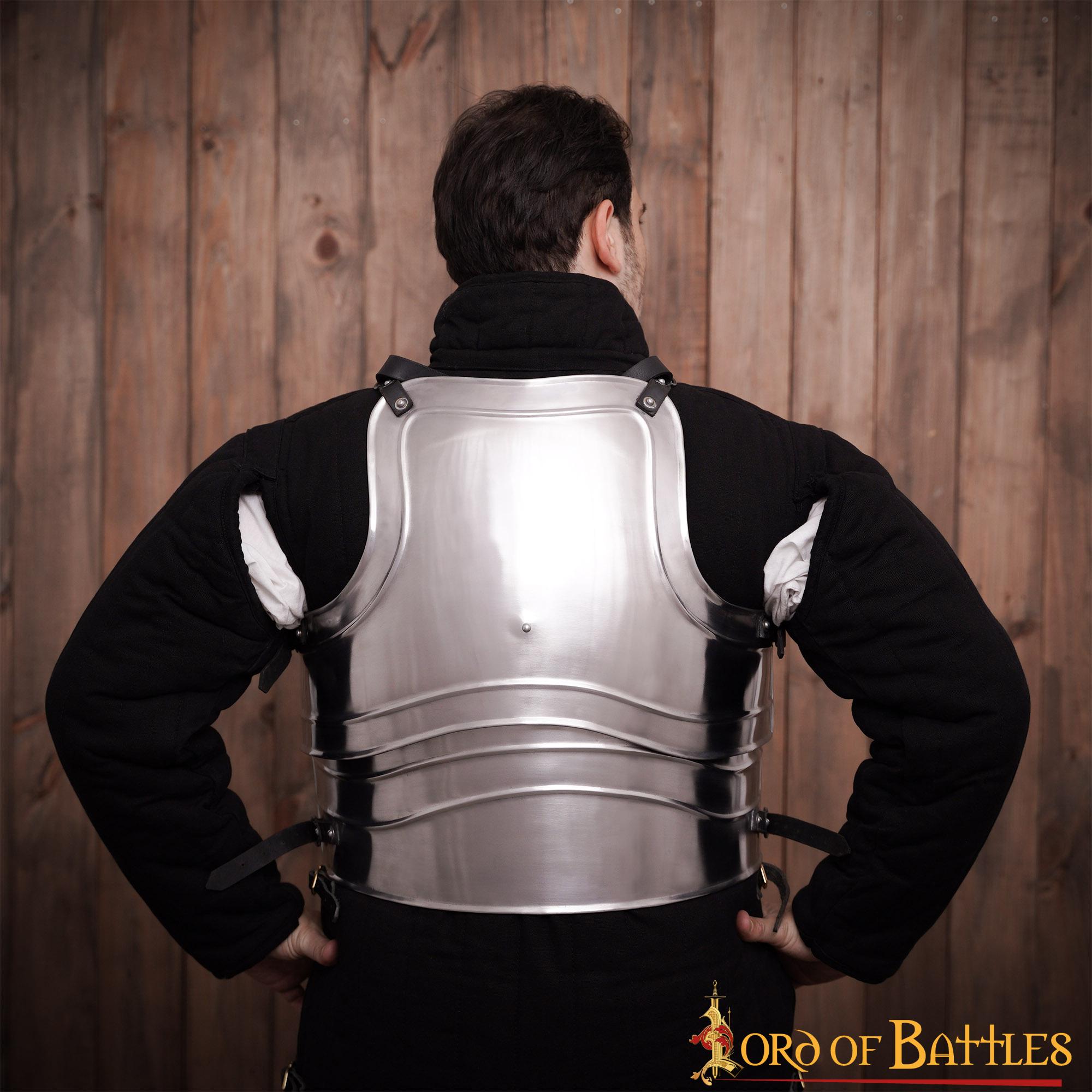 DescripciónHISTORIAEn el combate, los golpes al torso causaban el daño más grave. El tórax, el abdomen, la espalda y la pelvis son el hogar de la mayoría de órganos vitales, lo que puede causar dolor a través de golpes o cortes e impactando en el lugar adecuado con un solo golpe, puede dejar al oponente incapacitado o incluso matarlo. No es raro que su protección siempre haya recibido la máxima atención, junto con la cabeza, en el desarrollo de las armaduras.Colocada sobre la ropa, incluso las primeras armaduras tempranas perseguían el objetivo de ejercer como una tercera piel para proteger la parte superior del cuerpo de estocadas y cortes, absorber la energía de los golpes contundentes y mitigarlos mediante la distribución de la fuerza del impacto.A lo largo de la Edad Media, la armadura textil era el método más común para proteger la parte superior del cuerpo. Asequible hasta cierto punto, incluso para combatientes y soldados de leva, el gambesón sirvió a muchos guerreros como una armadura independiente.Aquellos que podían permitírselo usaban una cota de mallas a principios de la Edad Media, que cubría el torso hasta los muslos. También conocida desde tiempos anteriores, la armadura de escamas se encuentra ocasionalmente en uso en la Alta Edad Media.El avance de las armas durante la Alta Edad Media requirió el refuerzo de la armadura. Además de la cota de malla, los caballeros llevaban, al final de la Alta Edad Media, una brigantina: una camisa de armar de tela o cuero, cuyo interior estaba discretamente cubierto con escamas o remaches de metal.Con el auge de la armadura de placas a finales de la Edad Media, finalmente surge la coraza completa, una armadura de placas individuales para el pecho y la espalda. Esta estuvo en uso hasta que nacieron las armas de fuego, ante las cuales ofrecían poca protección.Los productos de metal requieren de unos cuidados para su correcto mantenimiento. La norma más importante es evitar todo lo posible la humedad (agua, sudor, salinidad, etc.). Almacenarla en un lugar seco y revisarlo cada varias semanas para detectar signos de oxidación. Si encuentra alguno, retíralo frotando el lugar afectado con un estropajo impregnado con aceite antioxidante.Si la pieza se moja, es importante que la seque completamente tan pronto como sea posible.Después de manipular, usar o tras de varios meses de almacenamiento o exhibición, todo el metal debe limpiarse con un paño limpio. Recomendamos lubricar ligeramente la superficie limpia conSpray Ballistol(aceite lubricante y antioxidante).Siguiendo estos consejos, cada vez que asistas a un Rol en Vivo (LARP) tu armadura lucirá limpia y resplandeciente.