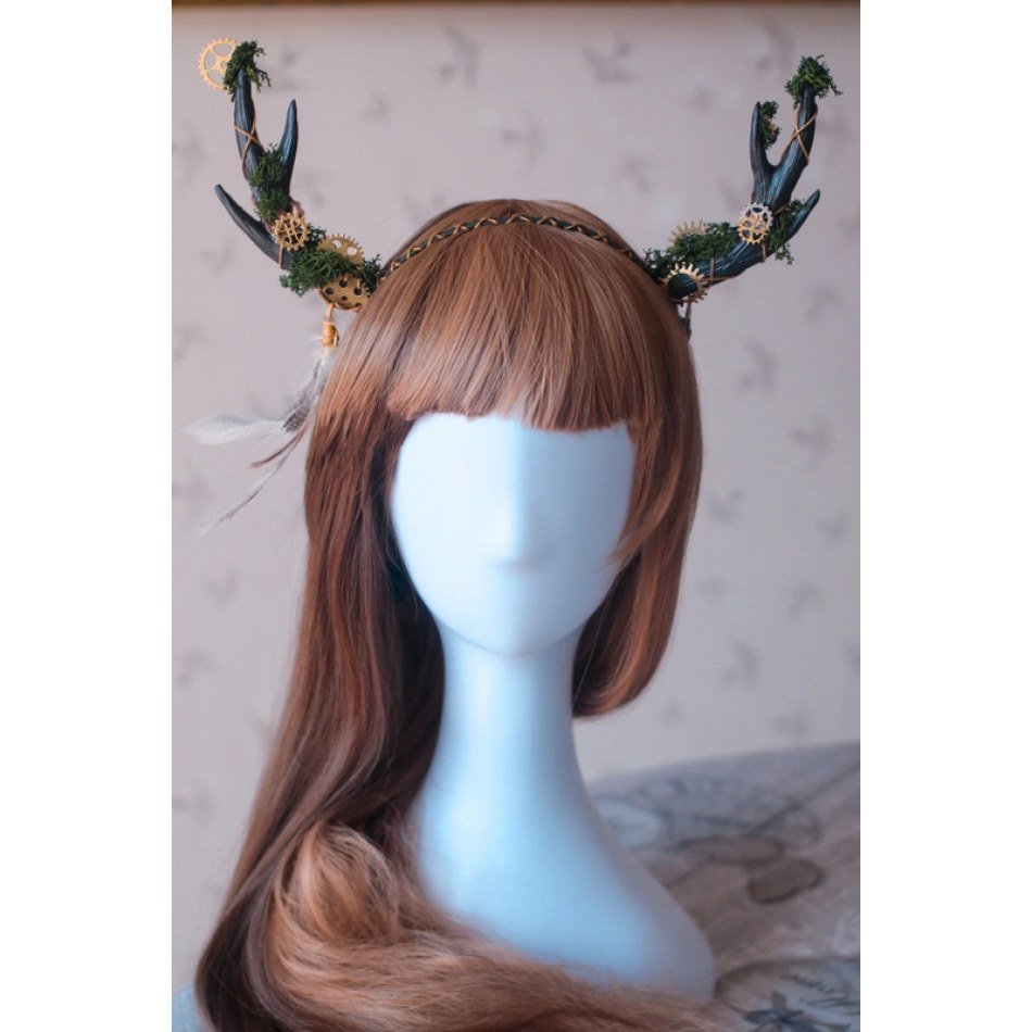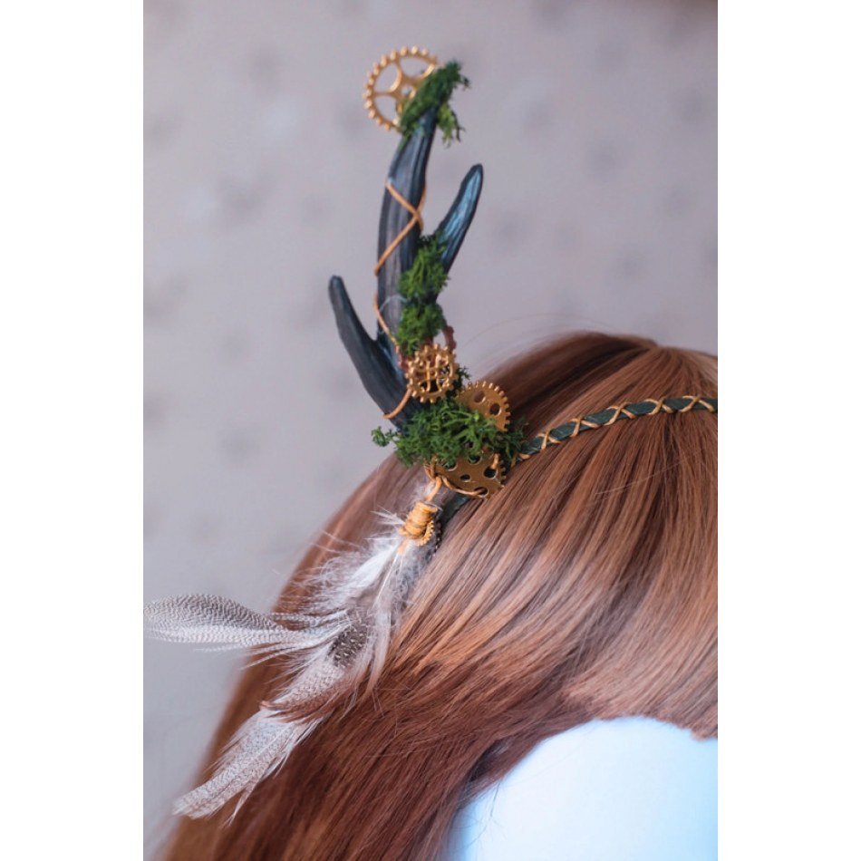 Los cuernos curvados, de tono oscuro y acabado texturizado, emergen desde una base decorativa. Están adornados con engranajes metálicos dorados, musgo artificial y plumas naturales. Todo ello se une con una cinta flexible que se ajusta con comodidad a la cabeza.