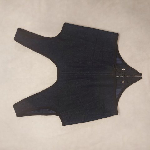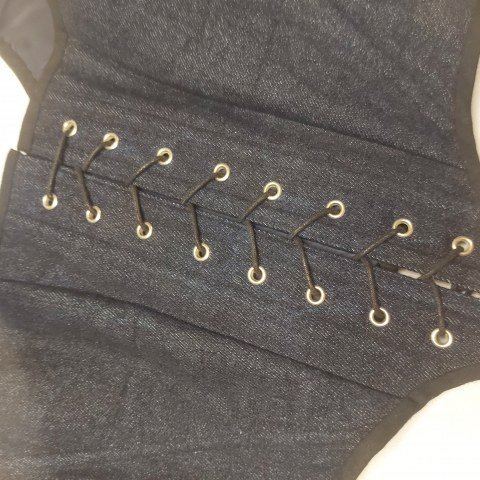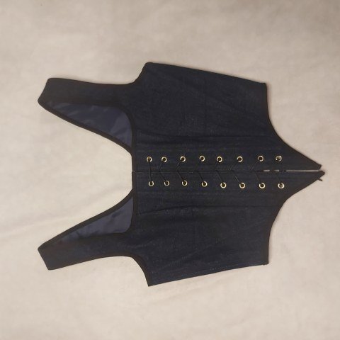 El corsé está elaborado a mano con tejido denim reutilizado, una opción sostenible que combina resistencia y estilo. Su forro interior de poliéster reciclado garantiza comodidad sin comprometer el impacto ecológico. El cuerpo del corsé incluye entretela reforzada y ballenas de plástico, logrando una silueta marcada sin rigidez excesiva. La pieza se ajusta a la forma del torso de manera envolvente, realzando el porte sin limitar el movimiento: ideal tanto para escenas intensas de rol en vivo como para paseos en ferias medievales o sesiones de fotos evocadoras.