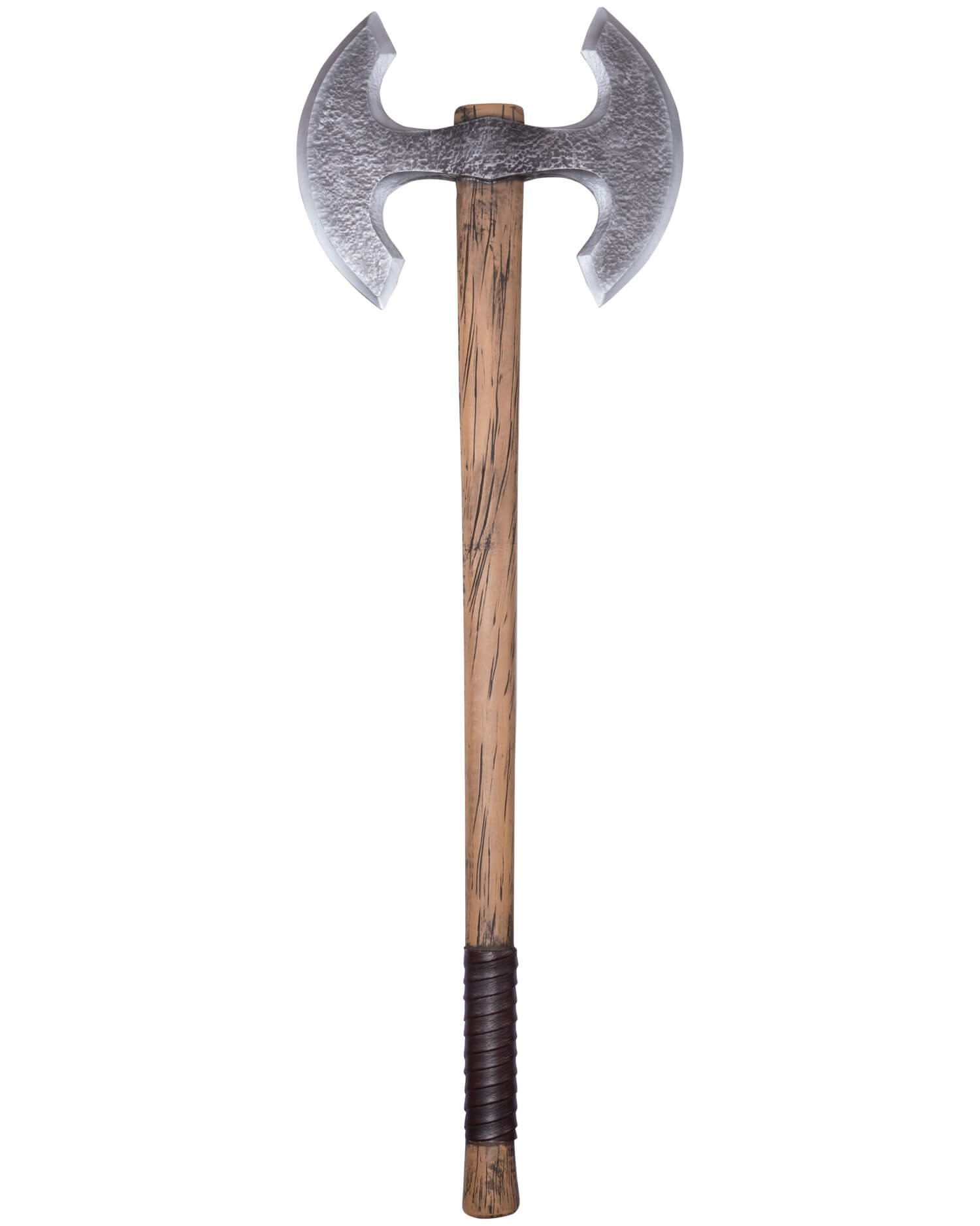 Descubre la poderosa hacha de doble hoja inspirada en el diseño de la fantasía nórdica. Fabricada con espuma PU de alta durabilidad, esta arma cuenta con dos amplias hojas montadas en un largo mango de color madera, que presenta un detalle de textura realista. La envoltura similar al cuero proporciona un agarre seguro, añadiendo un aspecto rústico y contundente.