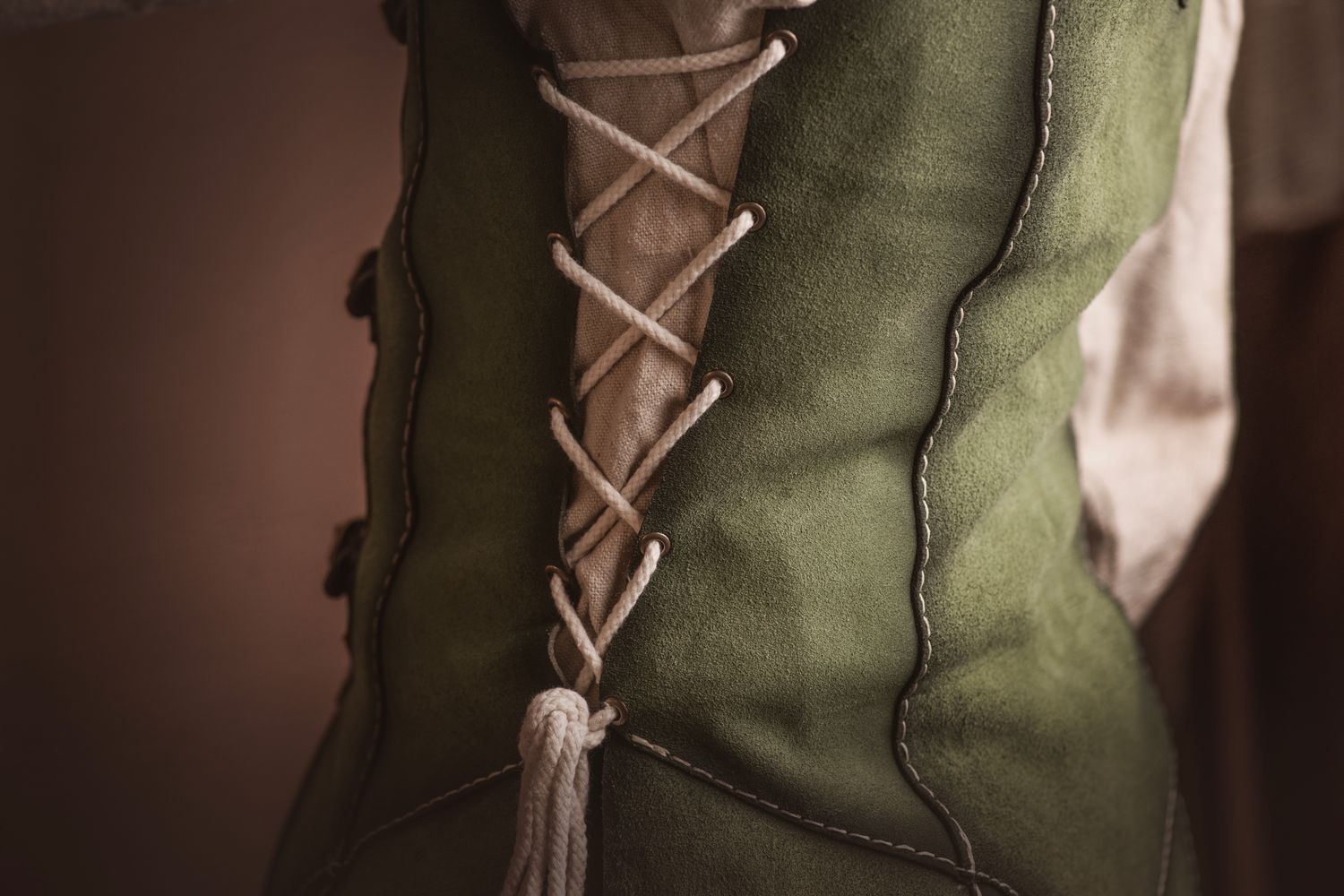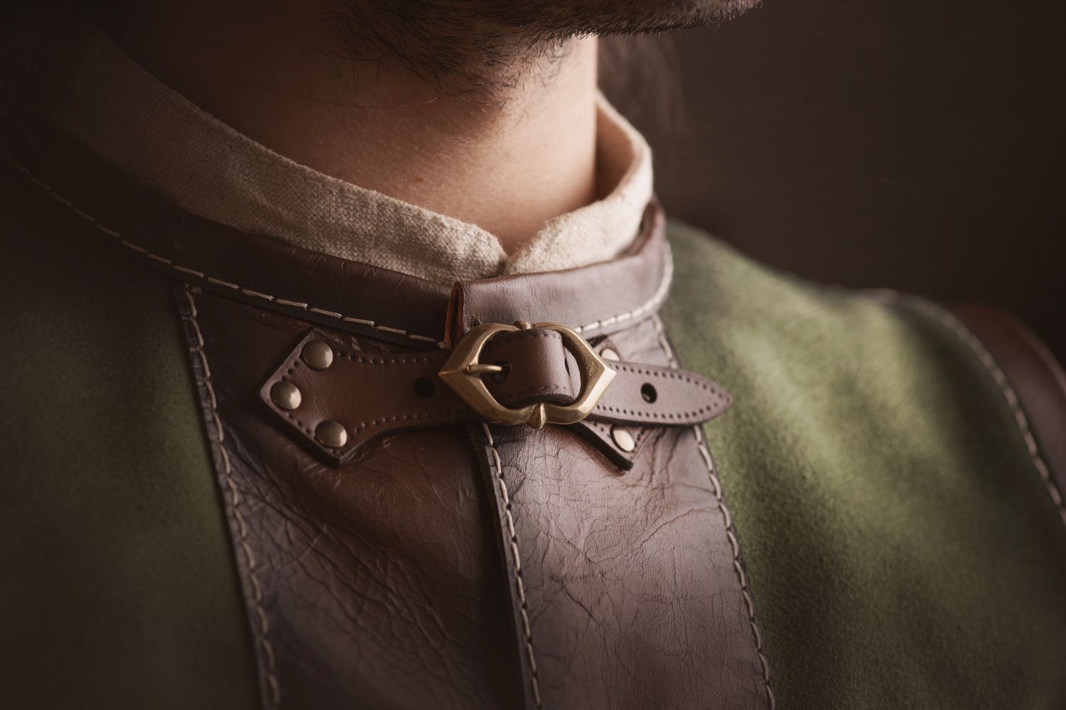 El cierre frontal con hebillas metálicas y los ajustes laterales con cordón blanco permiten un entalle preciso. Una vez ajustada, basta con cerrar las hebillas para vestirla con rapidez. Es una prenda tan cómoda como eficaz, pensada para días de entrenamiento, recreaciones históricas o largas jornadas de feria.
