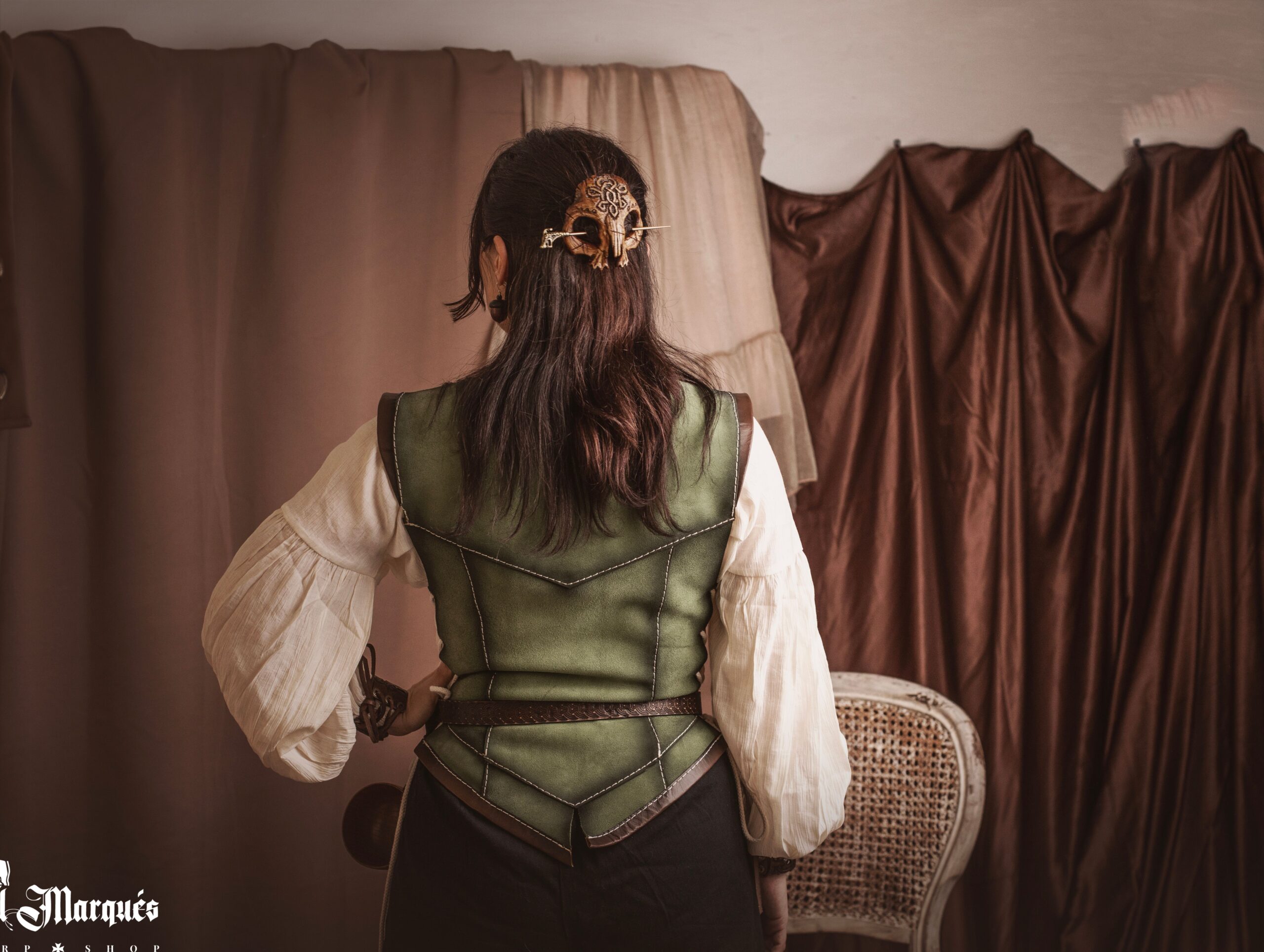 En las tierras donde se cruzan espadas y se forjan leyendas, la cuera verde del Marqués se alza como un símbolo de resistencia y elegancia. Diseñada para quien no teme adentrarse en campamentos invernales o desfilar con orgullo en los salones de un castillo, esta prenda une lo mejor del mundo guerrero y cortesano.