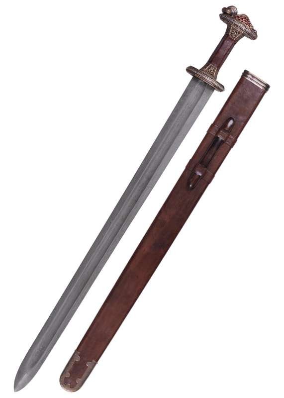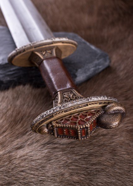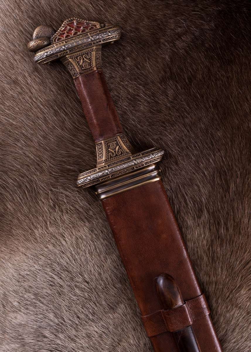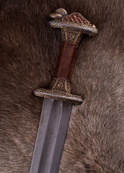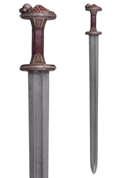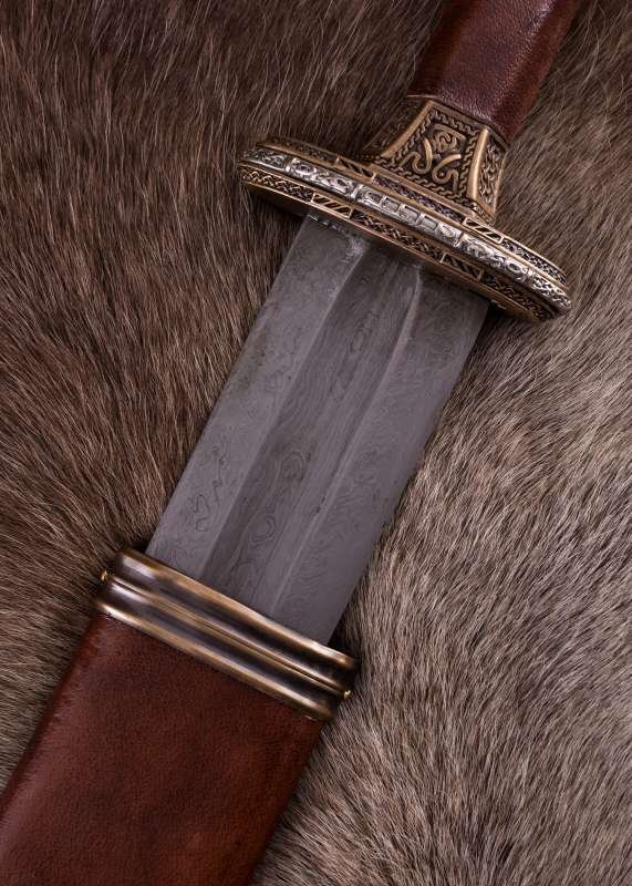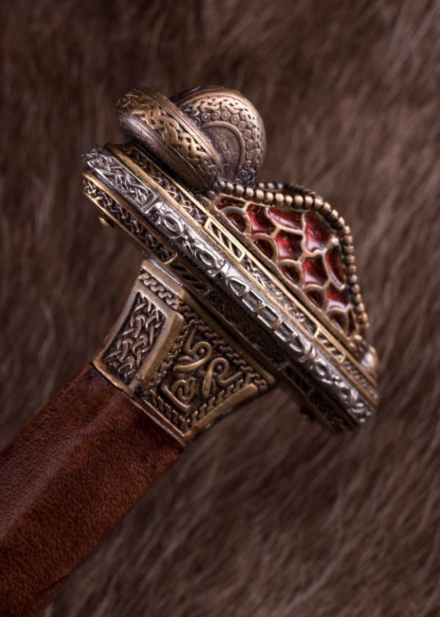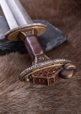Espada Vendel escandinava con empuñadura de latón y hoja de acero de Damasco. Inspirada en un célebre hallazgo de una tumba de barco cerca de Uppsala (Suecia), esta espada recrea con gran fidelidad un arma nórdica de los siglos VII-VIII. Su rica ornamentación y acabados de estilo antiguo evocan el prestigio ceremonial de los guerreros de élite de la era Vendel.