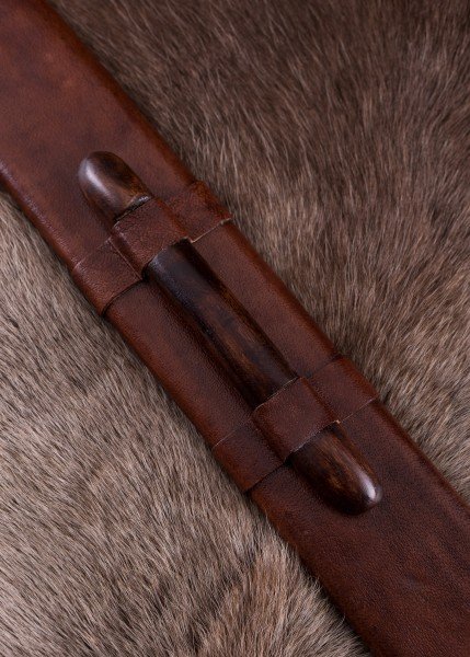 Se entrega con una vaina de madera forrada en cuero auténtico, con herrajes de latón, medallón y chape, además de correa compatible con cinturones de hasta 5 cm de ancho.