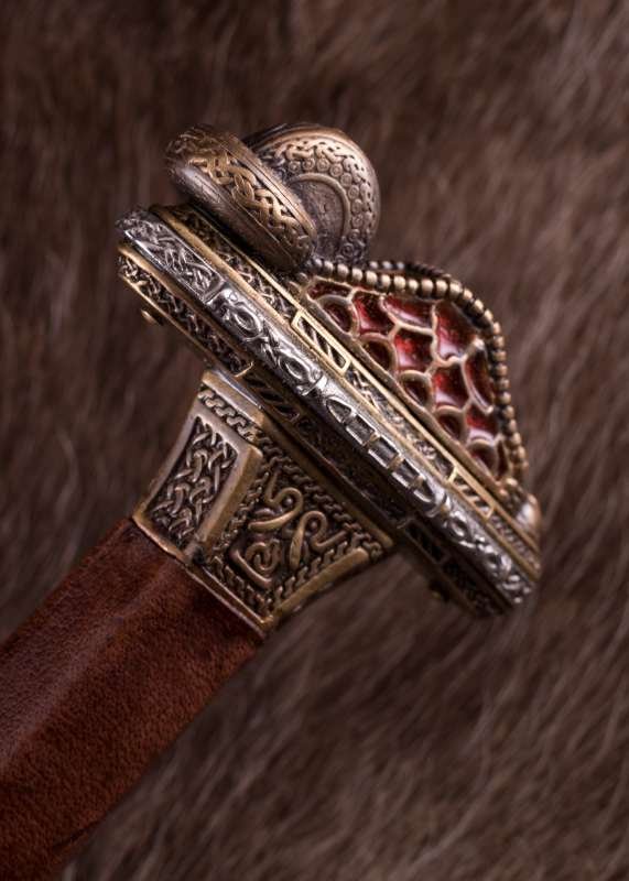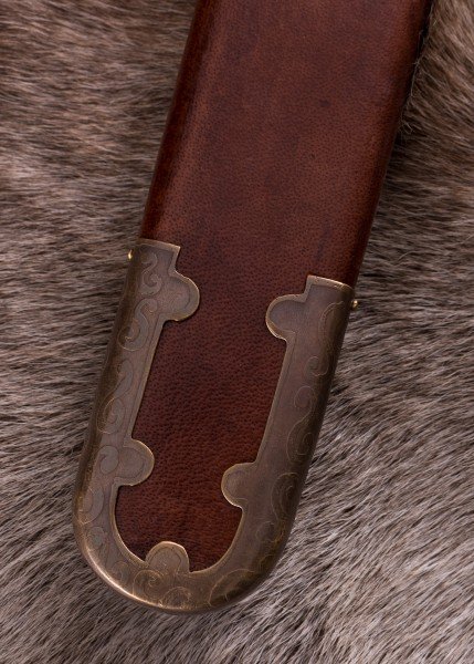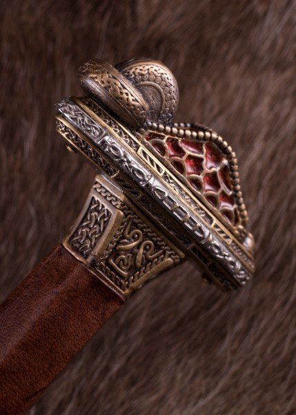 La empuñadura destaca por su guarda y pomo de latón con acabado envejecido, decorados con motivos grabados y detalles en peltre que realzan el contraste. La parte superior del pomo incorpora incrustaciones rojas que recuerdan a piedras de granate. El puño, con núcleo de madera, va revestido en cuero marrón.