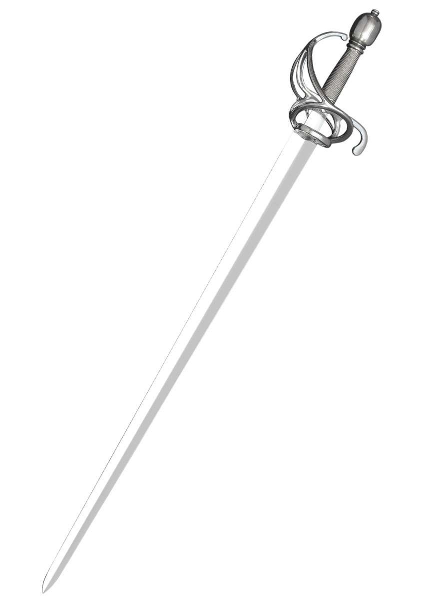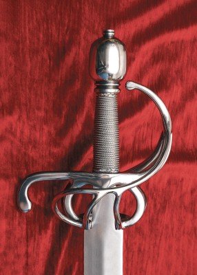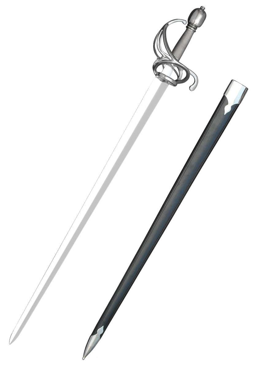 Diseñada para el uso práctico, su configuración de tajo y estocada combina una hoja algo más corta con una empuñadura sólida, ideal para el control en distancias cortas, como en peleas callejeras o riñas tabernarias. La hoja está fabricada en acero al carbono 1065 bien endurecido, mientras que la guarnición aporta robustez y equilibrio. La empuñadura de madera va envuelta en alambre de acero trenzado para ofrecer un agarre firme y seguro. Incluye funda de cuero. La hoja no está afilada.