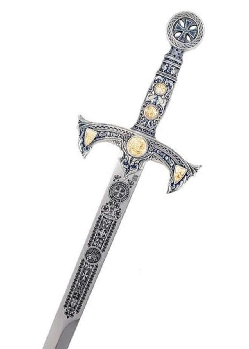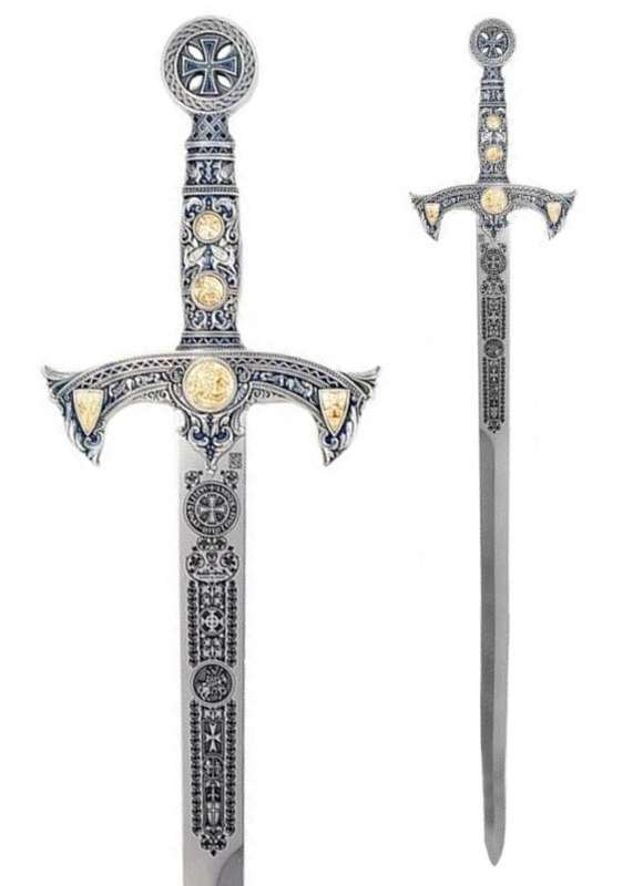 La Orden del Temple alcanzó su máximo esplendor en el siglo XIII y su lema, “NON NOBIS, DOMINE, NON NOBIS, SED TUO NOMINI DA GLORIAM”, refleja el espíritu de estos caballeros. Esta espada evoca esa tradición con un acabado elegante en plata y azul y detalles decorativos que realzan su carácter ceremonial.