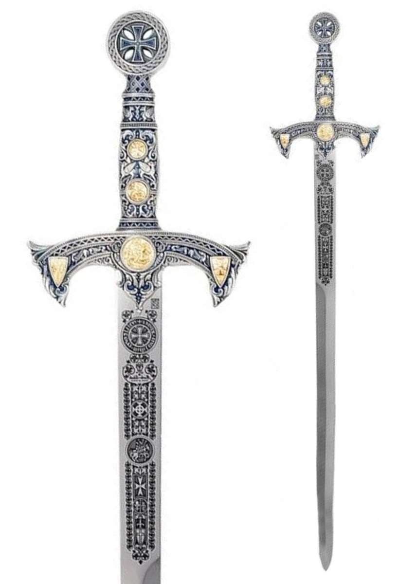 Espada templaria Marto en plata y azul con grabado decorativo: una pieza imponente inspirada en la historia de la Orden de los Caballeros Templarios (1118), símbolo de honor, fe y disciplina militar. Ideal para coleccionistas y amantes de la estética medieval que buscan una espada de presencia espectacular para exposición.