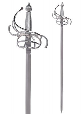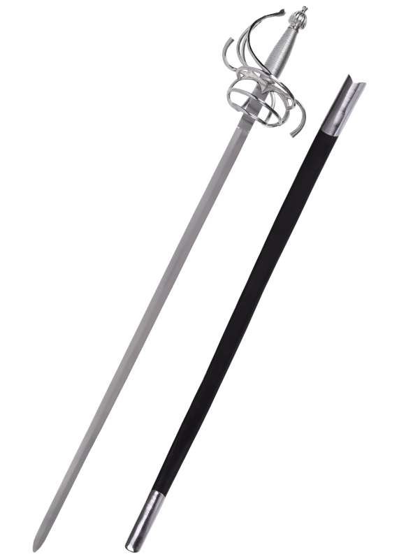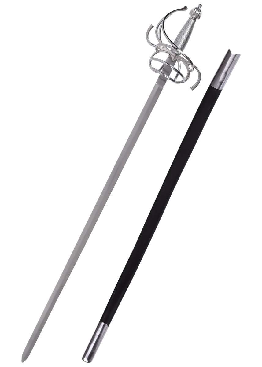 Estoque español de cesta con vaina inspirado en los modelos renacentistas que dominaron Europa entre los siglos XVI y XVII. Una pieza elegante y llamativa, pensada como artículo de colección, decoración o accesorio para cosplay y recreación, con una empuñadura protectora y un diseño fiel al estilo clásico de esgrima y duelo.