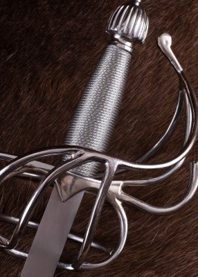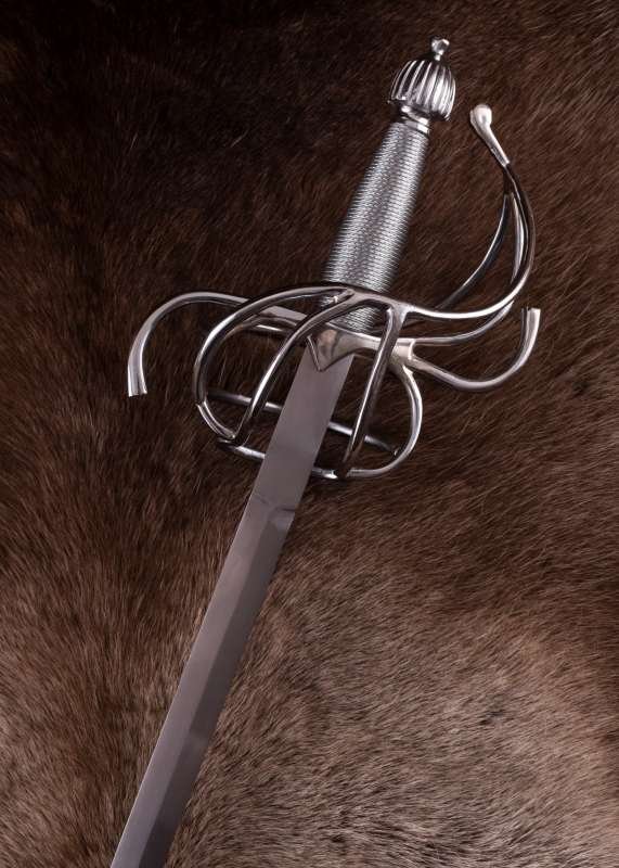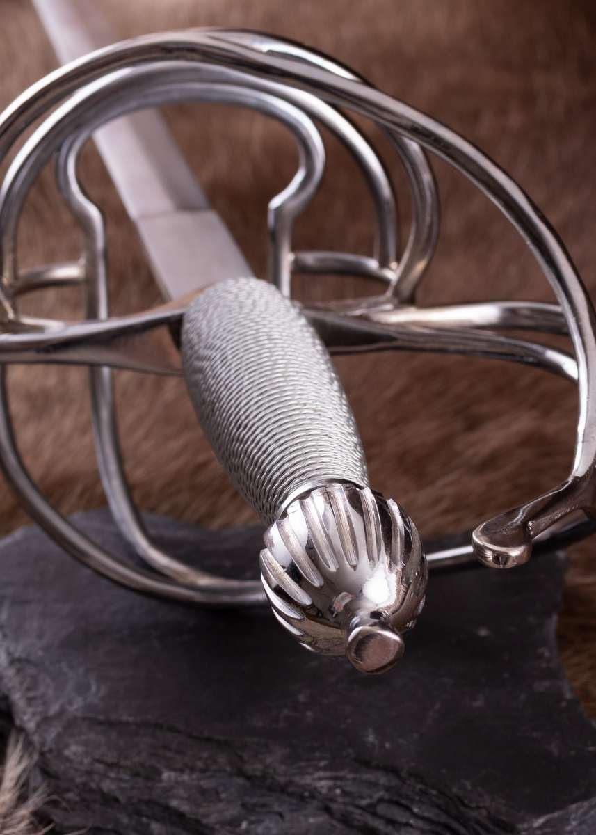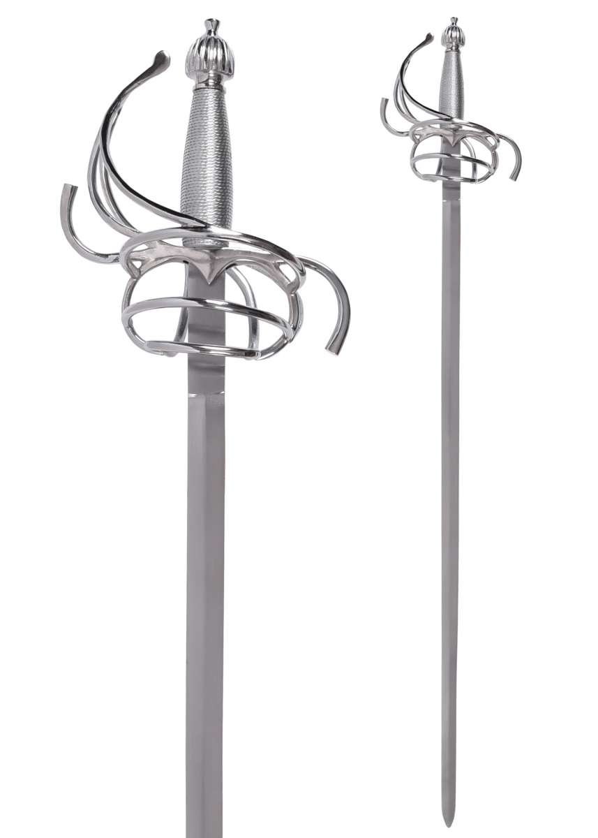 Su hoja larga, estrecha y de doble filo está fabricada en acero al carbono EN45 con sección en diamante y punta marcada, ideal para representar el carácter histórico del estoque. Los filos no vienen afilados y la construcción cuenta con espiga completa atornillada para un conjunto sólido. La empuñadura de cesta, con guarda en S, arcos y anillos, está realizada en acero inoxidable, aportando presencia y resistencia.