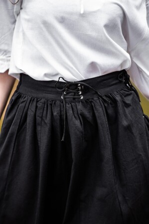 Tu Compañera Perfecta para Aventuras Épicas, nuestra falda Svenja está diseñada para acompañarte en tus propias aventuras modernas, ya sea en ferias renacentistas o eventos temáticos. Su silueta voluminosa con pliegues crea un movimiento fluido al caminar, haciéndote sentir como si fueras parte de una epopeya histórica. La versatilidad del ajuste gracias a los cordones asegura comodidad sin sacrificar estilo.
