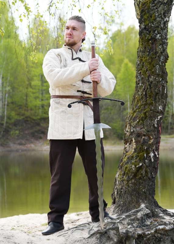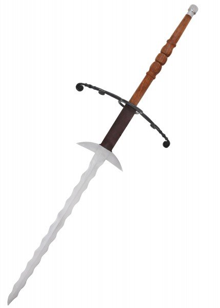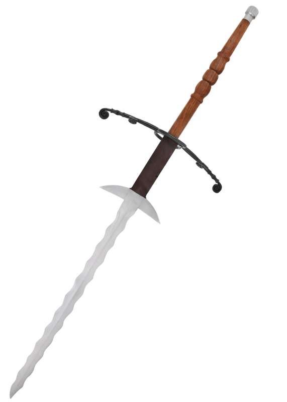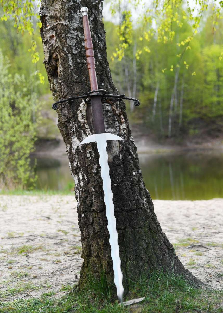 Espada Flamberge a dos manos (quillons sin montar): impone respeto con su inconfundible hoja ondulada en forma de llama, inspirada en una Bidenhänder flameada de finales de la Edad Media procedente del ayuntamiento de Emden. También conocida como Flammenschwert o Gassenhauer, este tipo de espada de hoja muy larga se asocia a formaciones capaces de abrir “carriles” en las líneas enemigas.