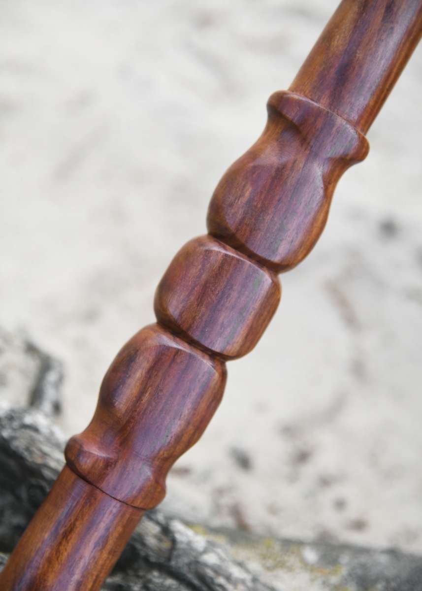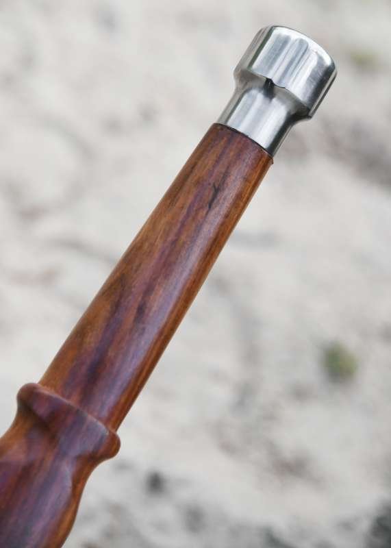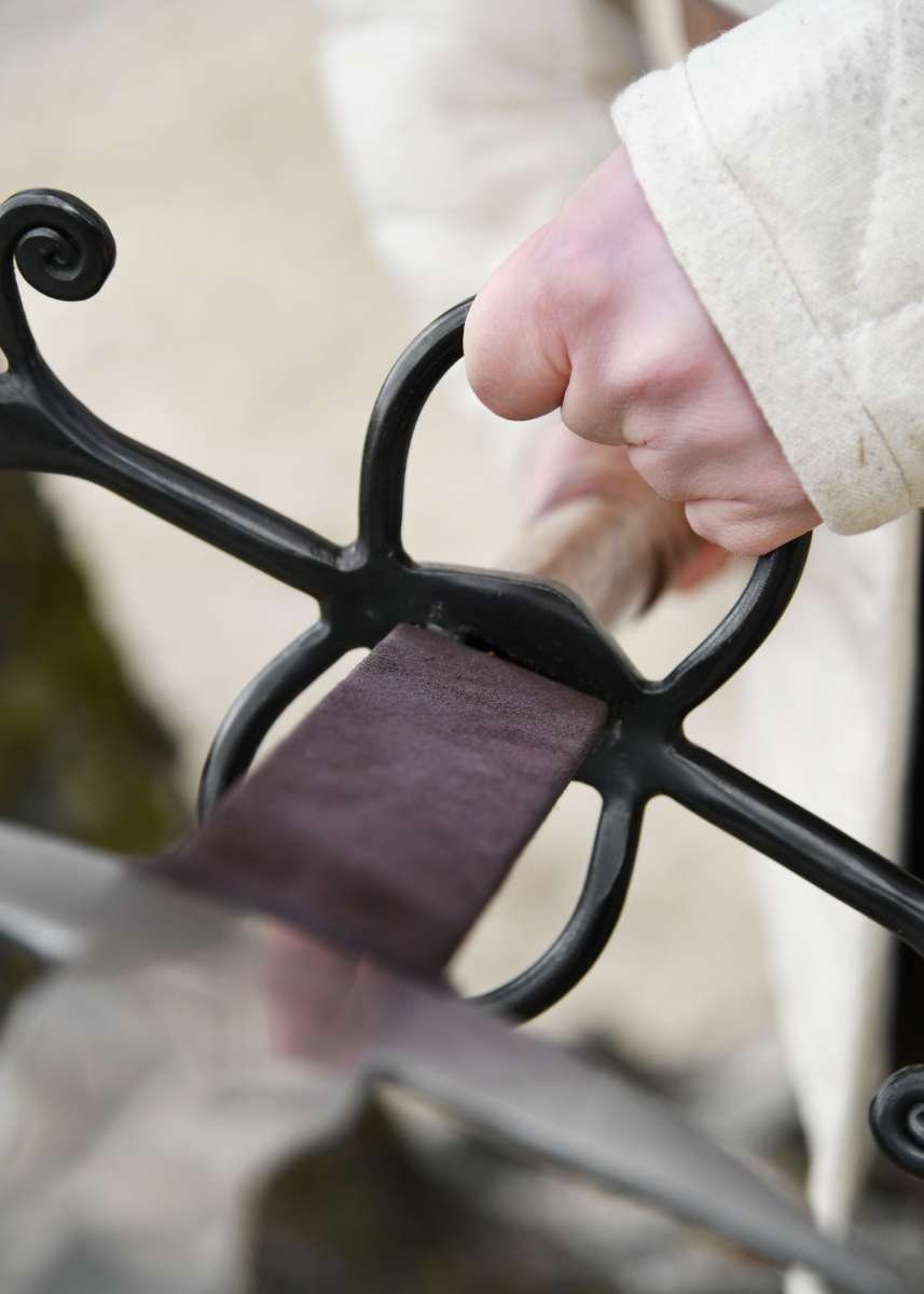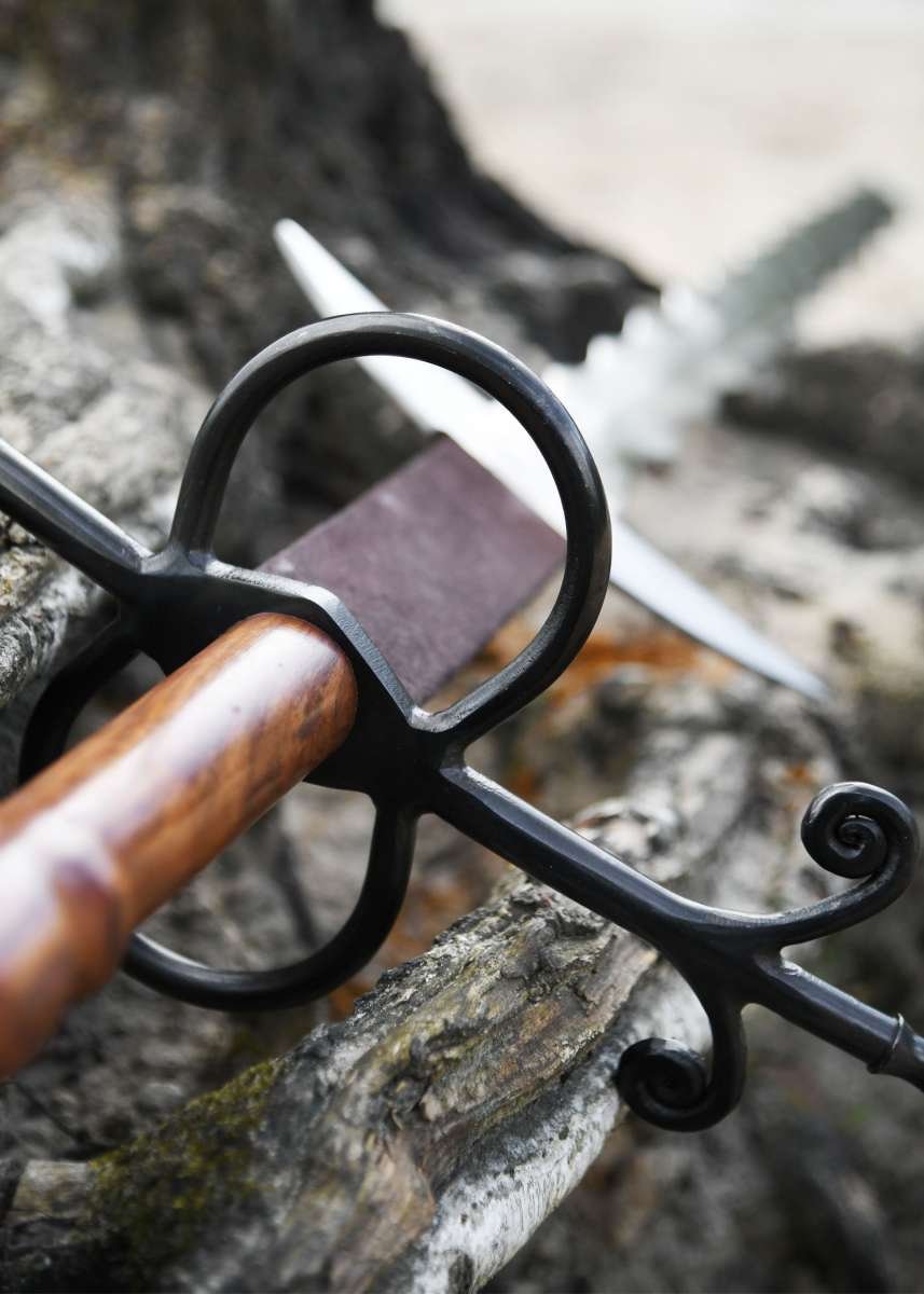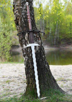Esta réplica cuenta con ricasso forrado de cuero, empuñadura de madera dura y una hoja sin afilar de acero al carbono, complementada por dos robustos ganchos de guarda. Para reducir costes y facilitar el envío, se entrega con la guarda cruzada sin montar, aunque el montaje final es sencillo: se desmonta pomo y empuñadura, se coloca la guarda en la espiga y se vuelve a ensamblar en orden inverso.