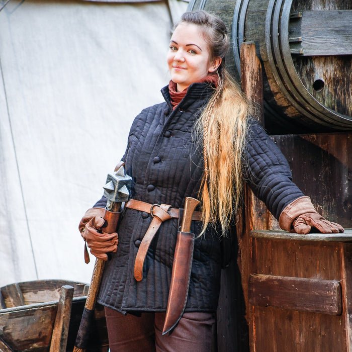 Para quienes buscan una mayor protección, recomendamos nuestros modelos Rabenfurth o Sturmeck. Este gambesón elegante es una prenda versátil, adecuada para caballeros y hombres de armas.
