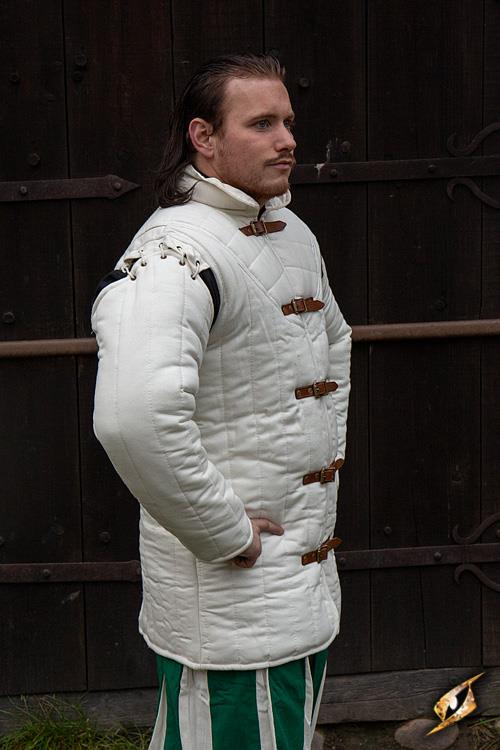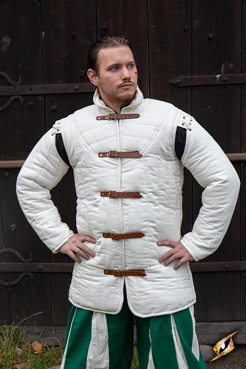MANTENIMIENTO Y RECOMENDACIONESConfeccionado con lona, tejido de alta resistencia, este producto es más resistente y pesado que el simple algodón. Entre sus dos capas de lona contiene un relleno esponjoso y mullido que ayudará a evitar rozaduras como las producidas por armaduras de metal o mallas y mitigar ligeros golpes. Al tratarse de un producto recio y duradero no necesita demasiados cuidados, sin embargo recomendamos seguir algunas instrucciones para su correcto mantenimiento.Para eliminar la suciedad y residuos utilice un cepillo y un paño seco. En caso de lavarla, recomendamos hacerlo a mano con agua fría cuando sea necesario, no obstante, en caso de querer lavarlo a máquina, aconsejamos hacerlo a máximo 30 ºC. Lavar por separado la primera vez y con colores similares después. No secar en secadora. Cuélguelo en seco o colóquelo plano para secarlo con mayor eficiencia. Para manchas generales o decoloración de la lona, trátelas con un limpiador de telas comercial o séquelo con agua tibia y un paño suave. También es posible plancharlo con un nivel alto de calor.Haz caso de nuestras recomendaciones y tus piezas de gambesón durarán muchos eventos LARP más como si fuera el primer día.»