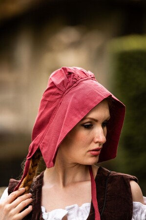 Imagina adentrarte en un mundo lleno de magia y misterio con nuestro gorro medieval Claire. Diseñado para capturar la esencia de una época pasada, este accesorio es mucho más que una simple prenda: es una llave a aventuras épicas. Con su diseño característico, que presenta un estilo capucha con parte superior redondeada y ajuste estructurado, este gorro envuelve tu rostro en un halo de historia. Las secciones fruncidas en la parte posterior crean pliegues sutiles, mientras que las largas cintas en el área del mentón permiten atarlo con elegancia debajo de tu barbilla.
