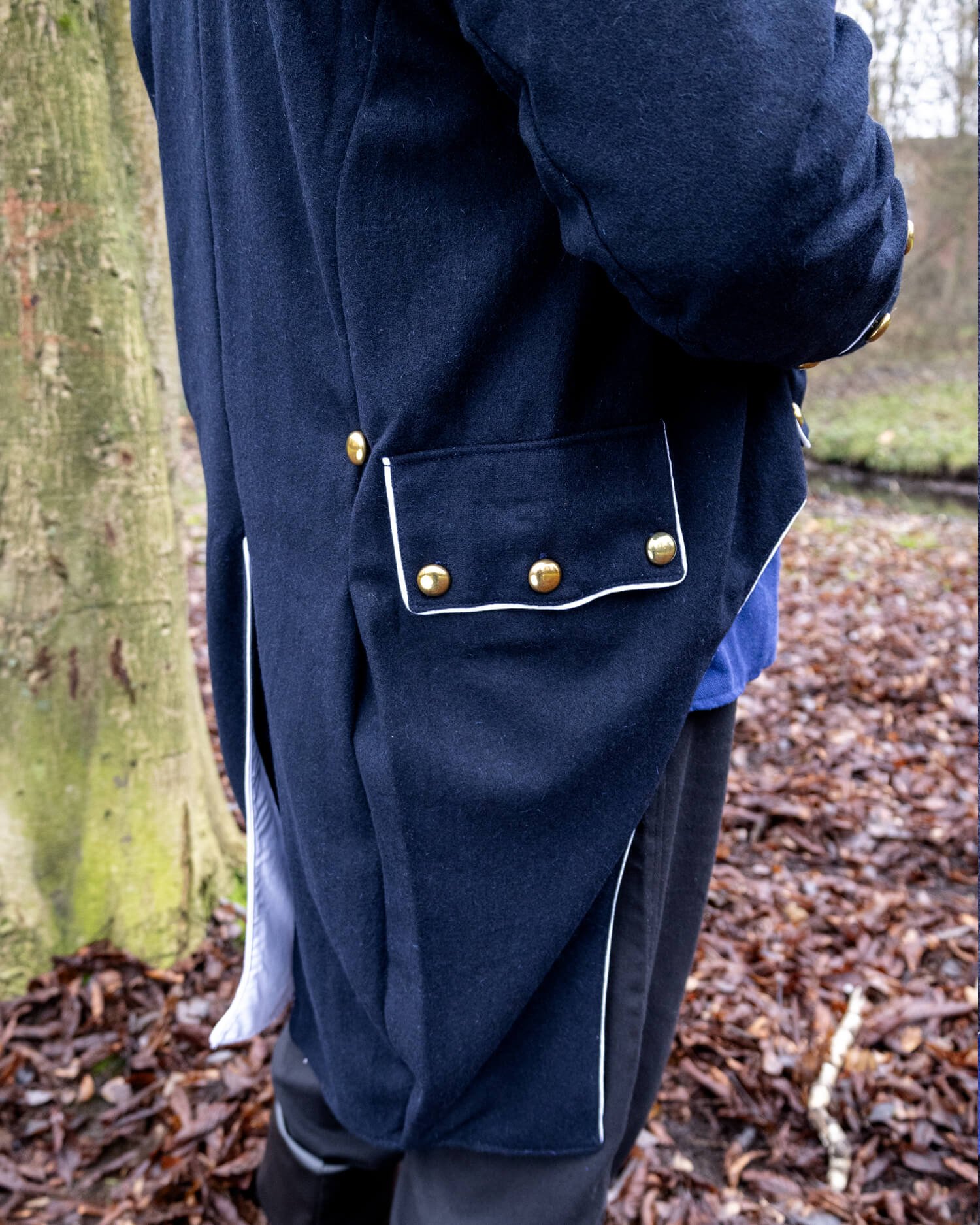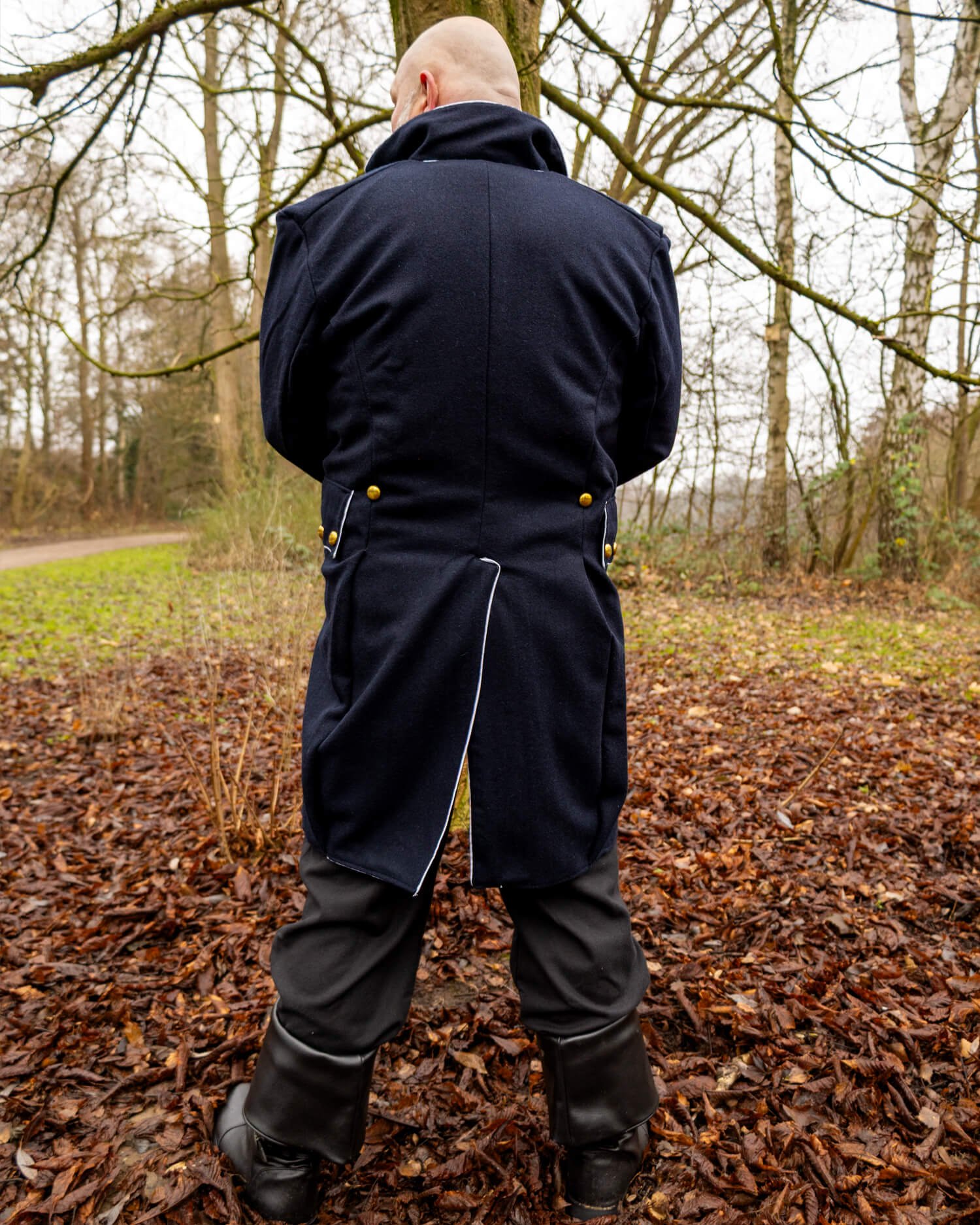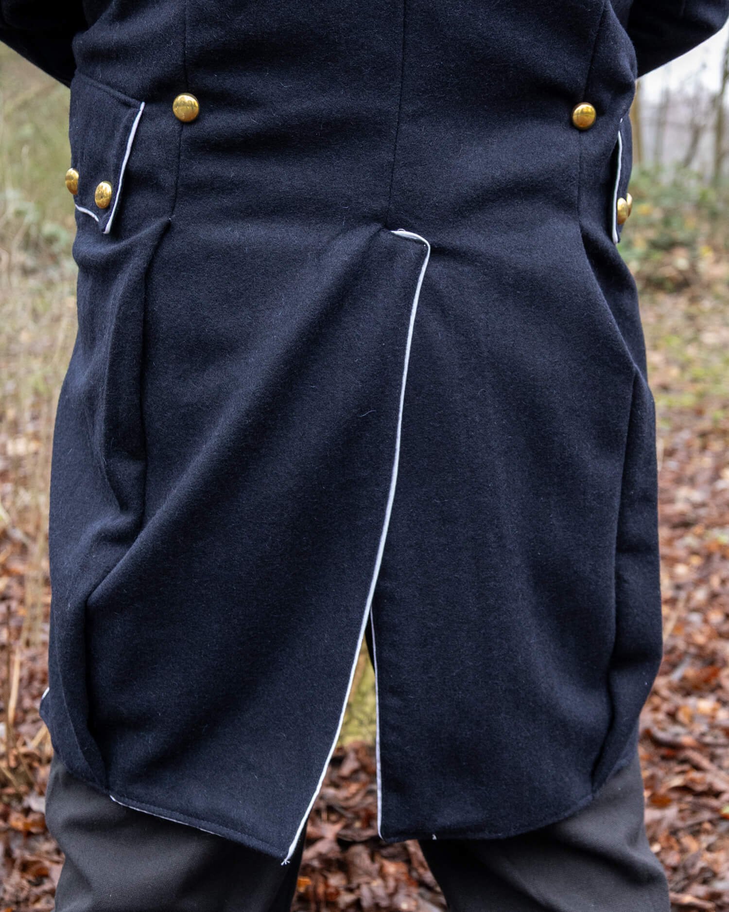 Inspirado en los abrigos navales y de oficiales de los siglos XVIII y XIX, su corte ajustado en la parte frontal se transforma en colas ligeramente acampanadas en la parte posterior. Las líneas limpias del diseño resaltan una postura erguida, reflejando el carácter disciplinado de un uniforme formal.