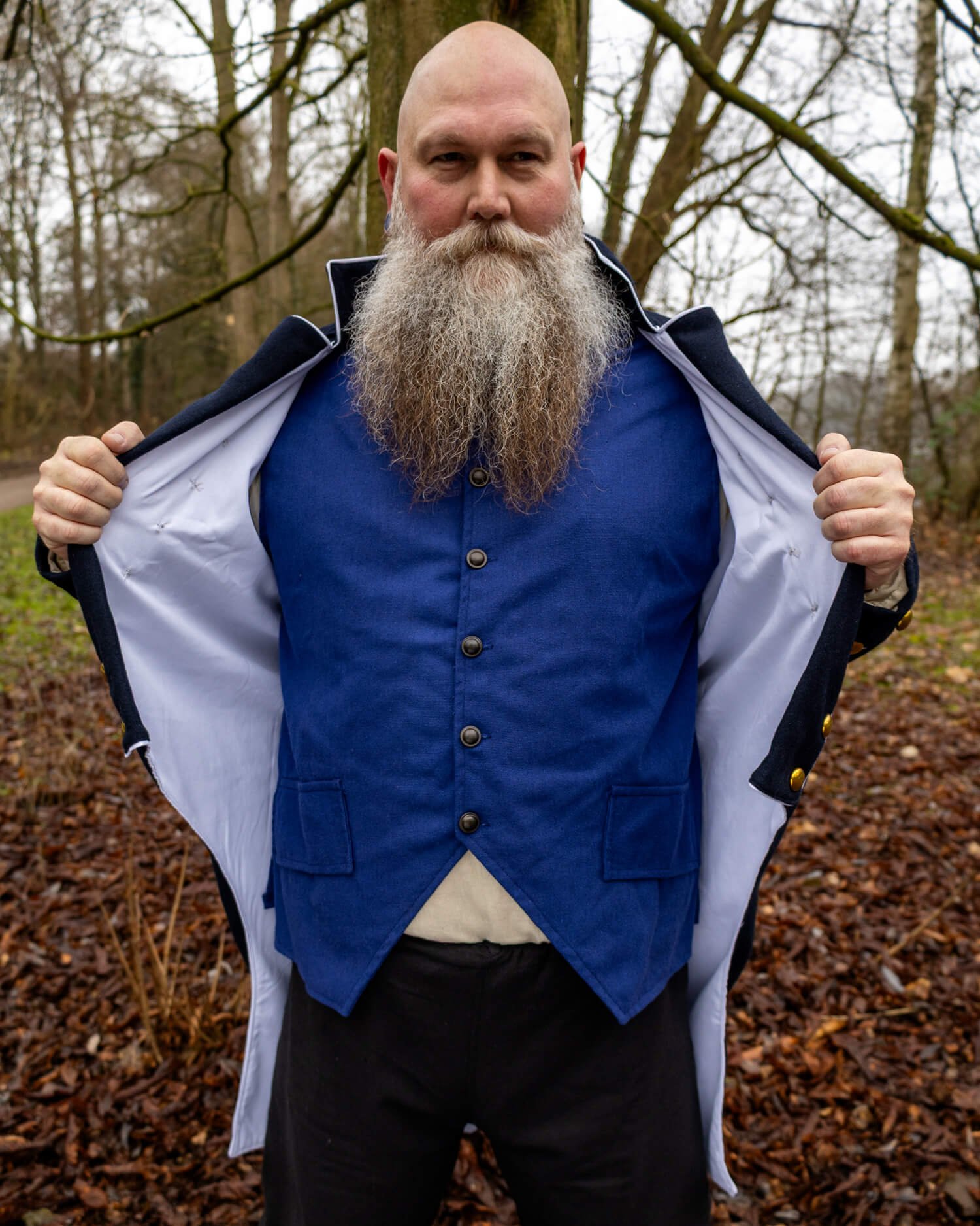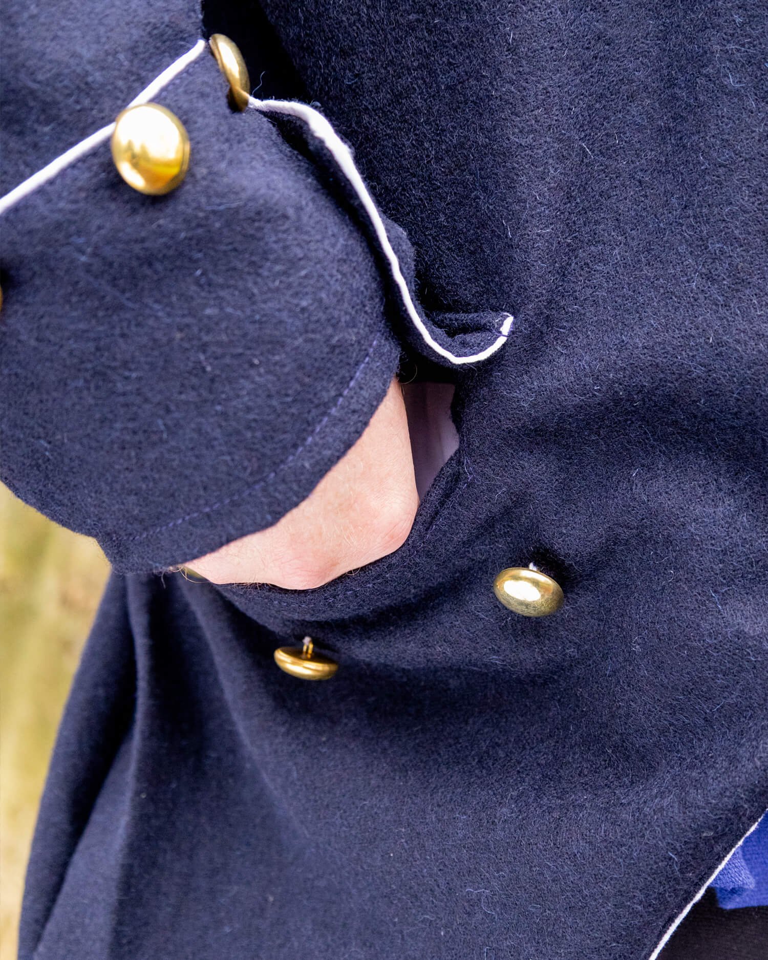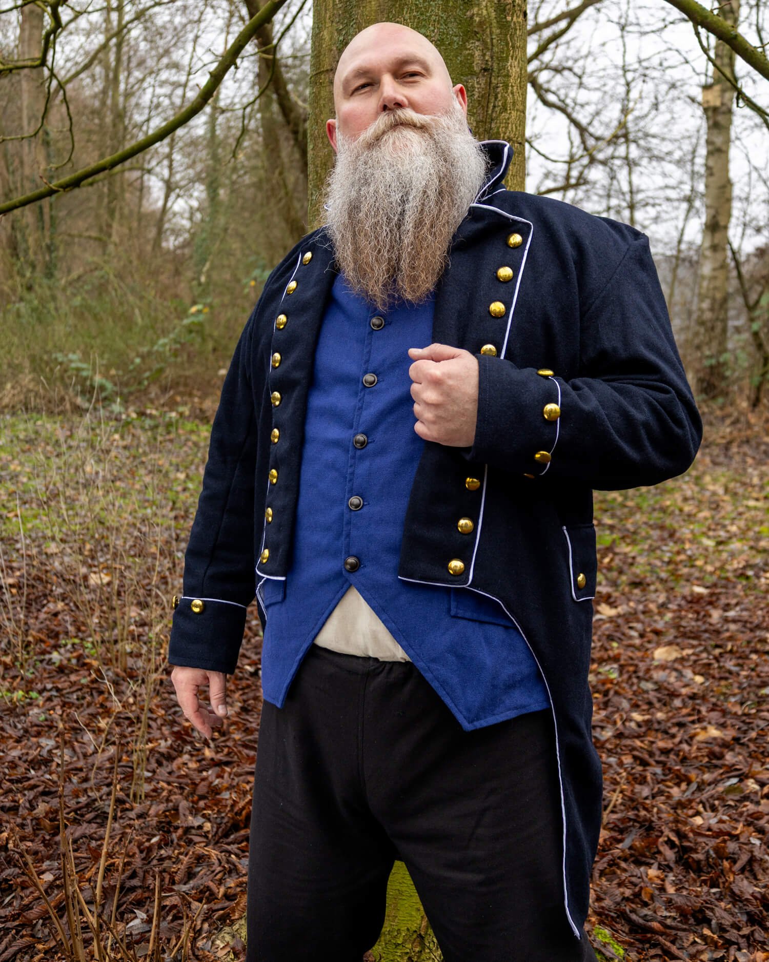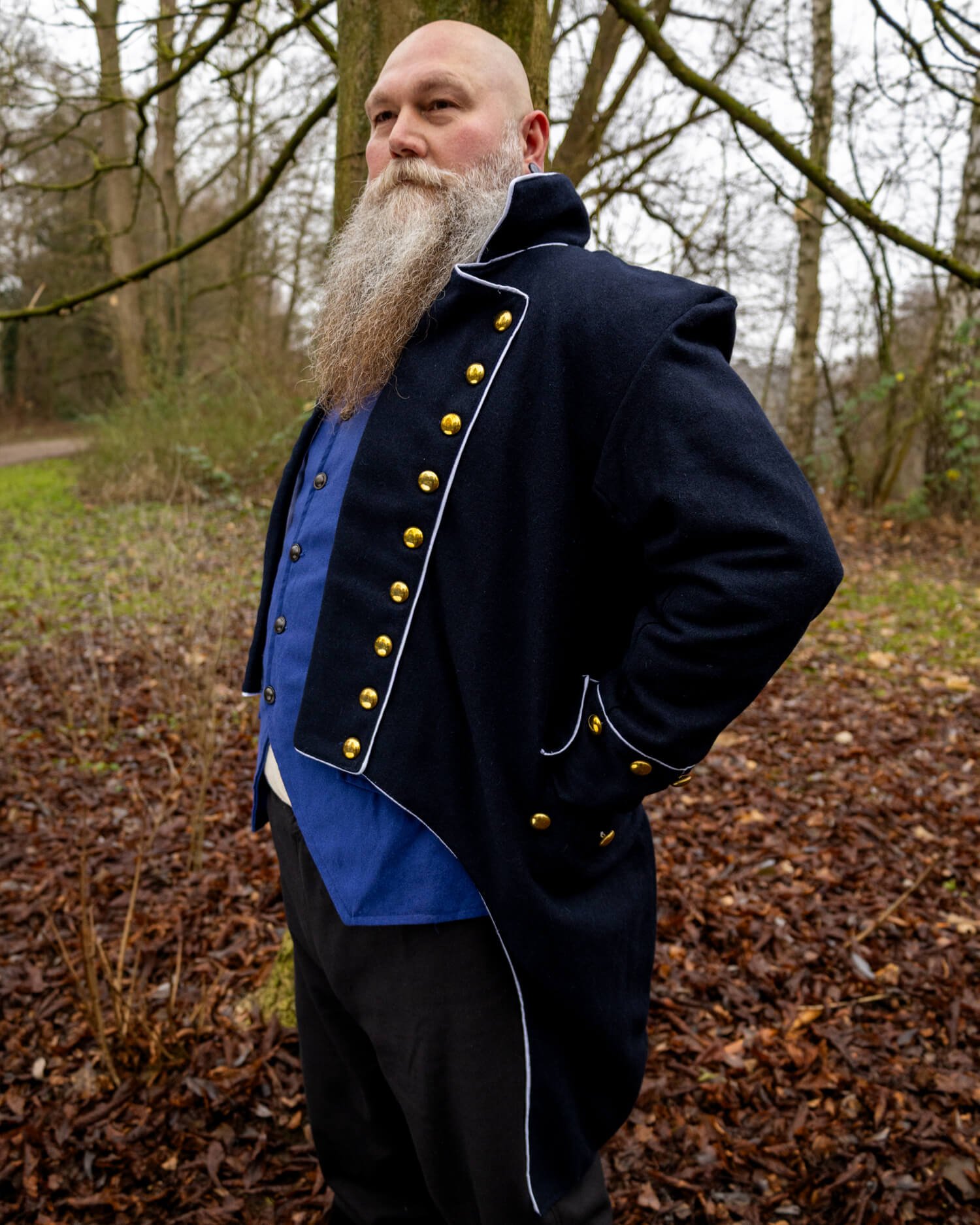 Inspirado en los abrigos navales y de oficiales de los siglos XVIII y XIX, su corte ajustado en la parte frontal se transforma en colas ligeramente acampanadas en la parte posterior. Las líneas limpias del diseño resaltan una postura erguida, reflejando el carácter disciplinado de un uniforme formal.