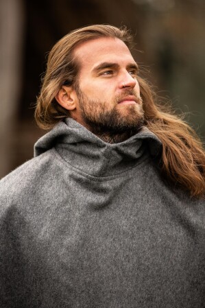 El diseño de nuestra gugel se inspira en los estilos medievales, cuando las gugels eran utilizadas tanto por nobles como por viajeros para protegerse del clima impredecible. Este tipo de prenda no solo ofrecía comodidad, sino también un toque distintivo gracias a su forma puntiaguda que se extiende desde la parte trasera de la capucha. Esta silueta fluida sin cierres visibles refleja la simplicidad y funcionalidad apreciadas en ese entonces.