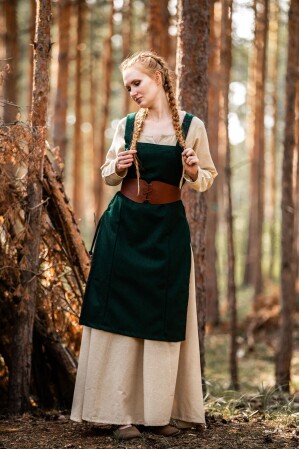 Adéntrate en el mundo de los vikingos con nuestro auténtico sobrevestido de lana Aila. Diseñado meticulosamente para revivir la esencia de la Alta Edad Media, este vestido sin mangas cuenta con anchos tirantes y un diseño que se ajusta perfectamente en la parte superior, extendiéndose hasta justo debajo de las rodillas. Los paneles frontales y traseros son rectos, mientras que los laterales abiertos cuentan con un sofisticado sistema de cordones cruzados que permite ajustar el vestido a tu medida perfecta. Estos detalles no solo proporcionan un ajuste cómodo, sino que también aportan autenticidad histórica a tu atuendo.