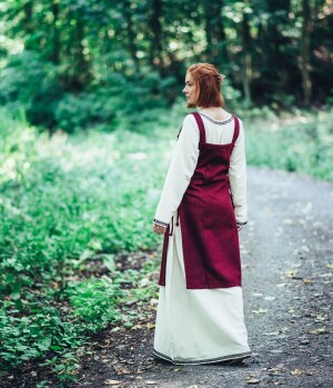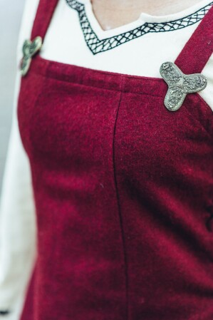 Adéntrate en el mundo de los vikingos con nuestro auténtico sobrevestido de lana Aila. Diseñado meticulosamente para revivir la esencia de la Alta Edad Media, este vestido sin mangas cuenta con anchos tirantes y un diseño que se ajusta perfectamente en la parte superior, extendiéndose hasta justo debajo de las rodillas. Los paneles frontales y traseros son rectos, mientras que los laterales abiertos cuentan con un sofisticado sistema de cordones cruzados que permite ajustar el vestido a tu medida perfecta. Estos detalles no solo proporcionan un ajuste cómodo, sino que también aportan autenticidad histórica a tu atuendo.