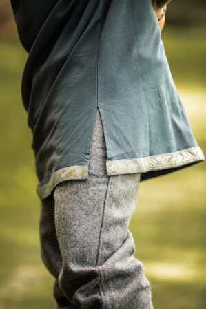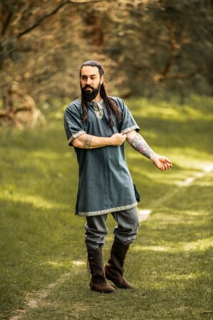 La túnica Njal está cuidadosamente inspirada en las vestimentas vikingas, una época conocida por su audacia y exploración. Estos aventureros legendarios apreciaban prendas funcionales y resistentes, características que hemos incorporado en nuestro diseño actual. La túnica era esencial para los vikingos como prenda versátil, adecuada tanto para el combate como para las reuniones sociales, simbolizando la vida dinámica de estos navegantes del norte.