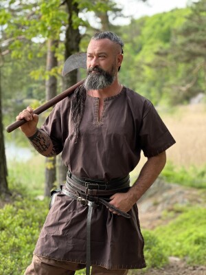 Los vikingos son recordados no solo por sus conquistas, sino también por su rica cultura textil. Las túnicas eran prendas esenciales que reflejaban habilidad artesanal y diseño práctico. Nuestra túnica captura esta esencia al incorporar detalles bordados inspirados en el arte temprano medieval. Esta prenda no solo evoca el espíritu aventurero de los vikingos, sino que también rinde homenaje a su tradición artística.