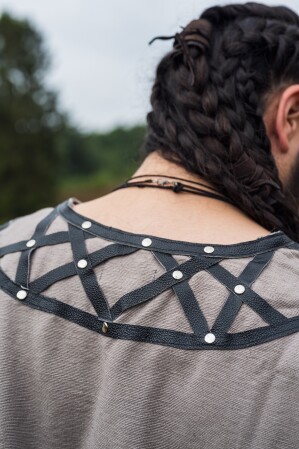 Descubre nuestra Túnica Vikinga Erik, una prenda que conjuga la funcionalidad y el diseño inspirado en la historia para hacerte sentir como un verdadero guerrero del norte. Con un diseño hasta la rodilla, esta túnica está adornada con aplicaciones de cuero auténtico y pequeñas tachuelas que le dan un toque único. Presenta un escote en V con un patrón entrecruzado que no solo añade carácter sino también elegancia. Las mangas largas y las aberturas laterales garantizan comodidad y libertad de movimiento, permitiéndote enfrentar cualquier desafío.