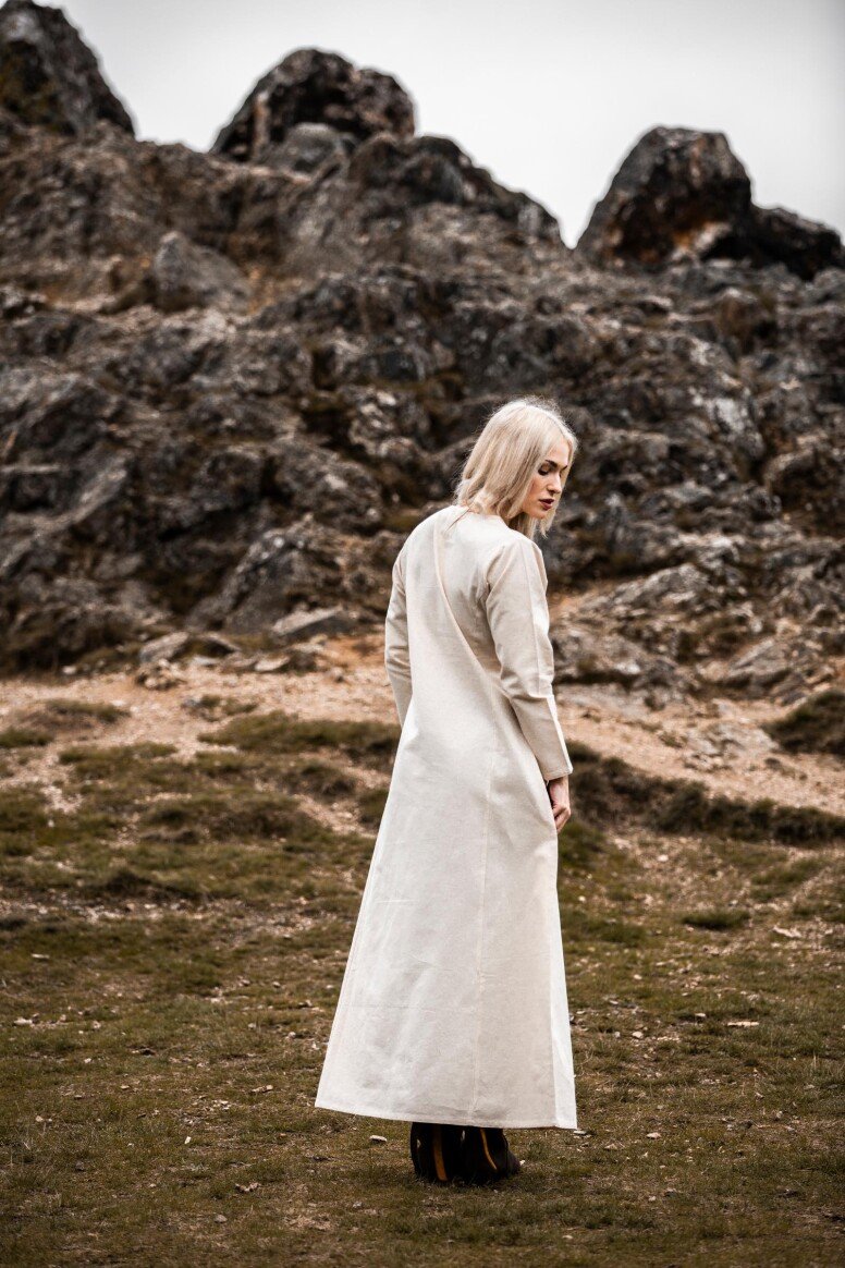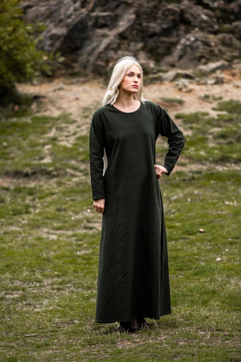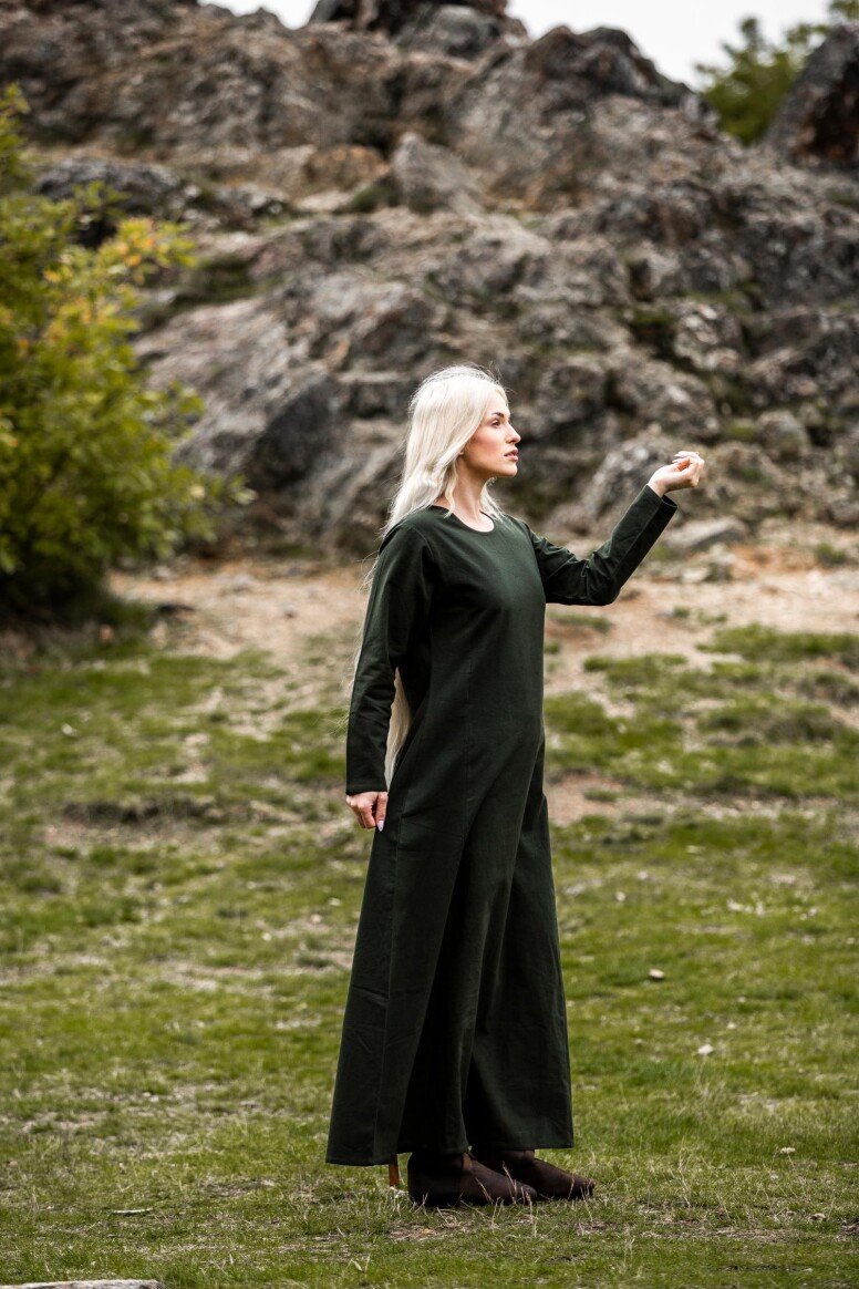 Nuestro vestido está inspirado por los diseños de la Alta Edad Media, una era llena de misterio y encanto. Aunque no podemos asegurar su exactitud histórica, este vestido refleja el espíritu de aquellos tiempos. Durante esta época, las prendas holgadas eran preferidas por su confort y facilidad de movimiento, permitiéndote sentirte como una auténtica dama medieval lista para cualquier aventura.
