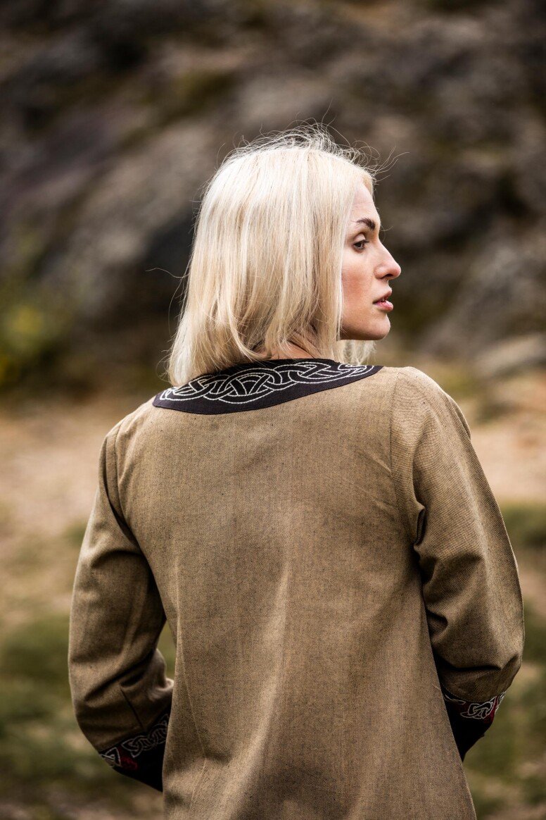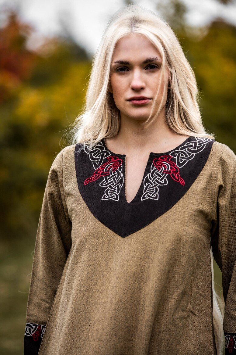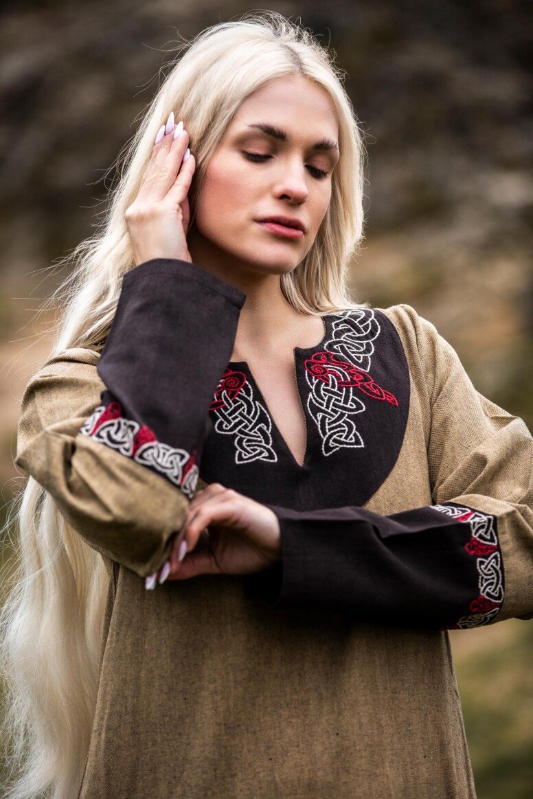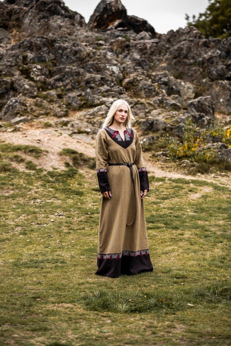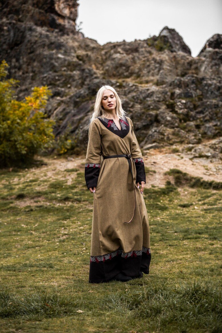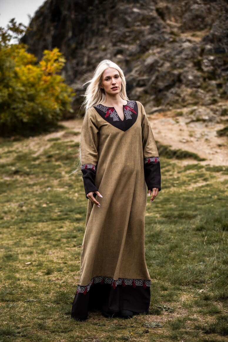 Inspirado en la época vikinga, este vestido refleja la artesanía detallada propia de aquellos tiempos, sin pretender ser una recreación fiel. Durante estas épocas, los vestidos largos eran símbolo de estatus y artesanía. Los bordados hechos a mano evocan el arte tradicional nórdico, simbolizando protección y buena fortuna para sus usuarios.