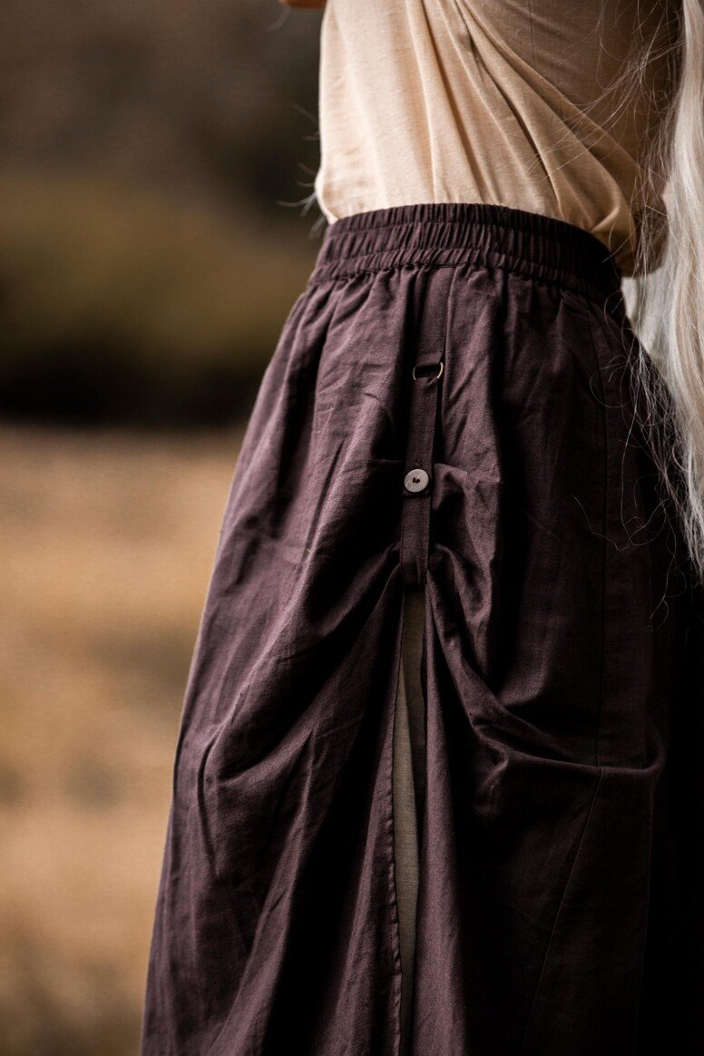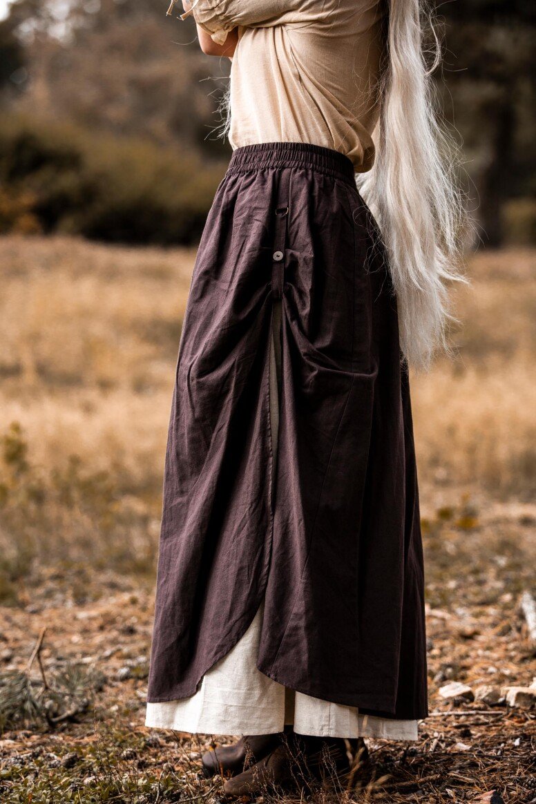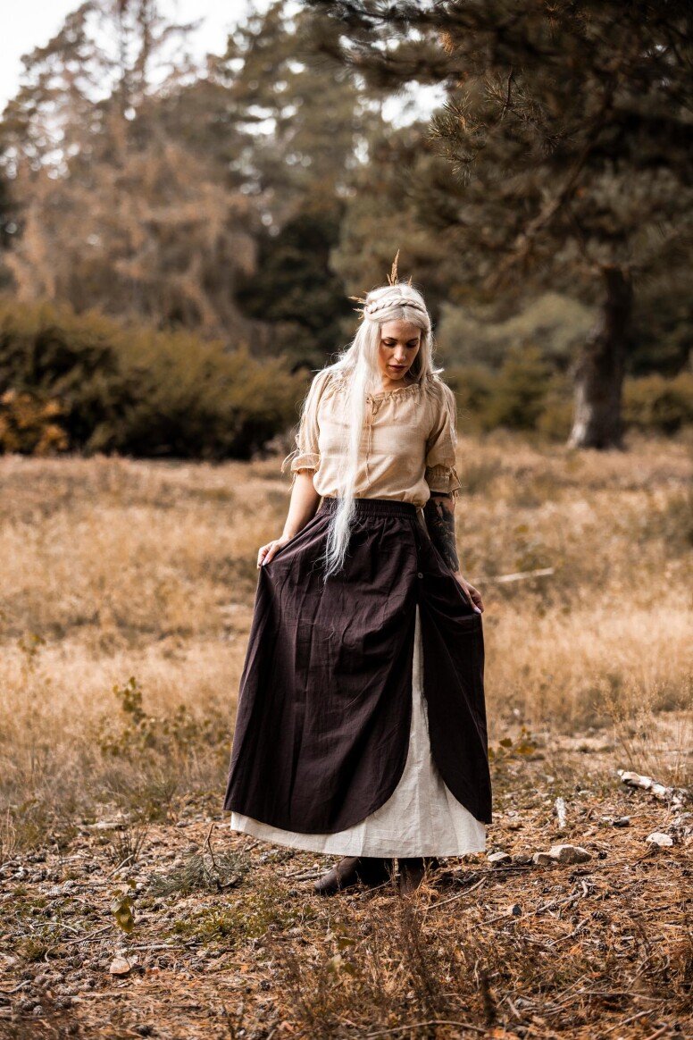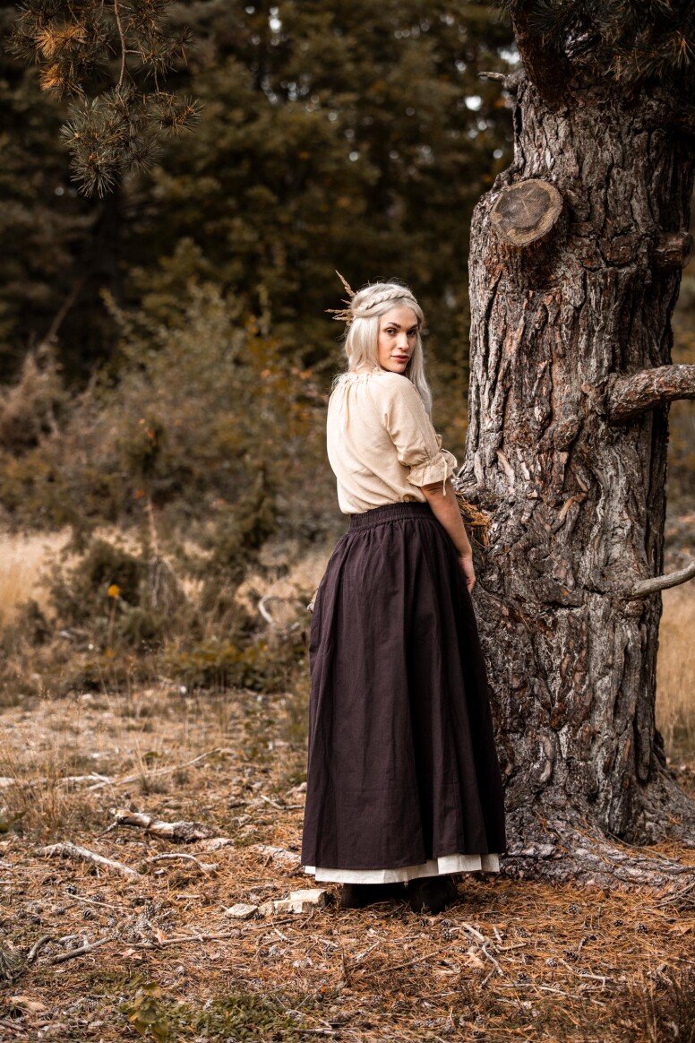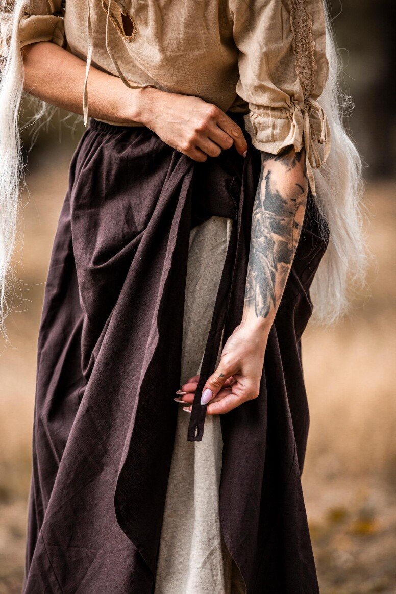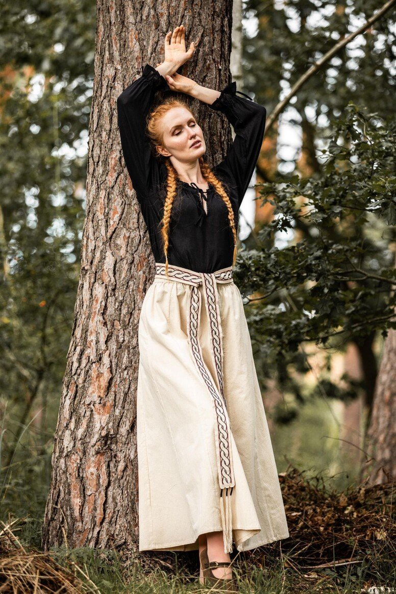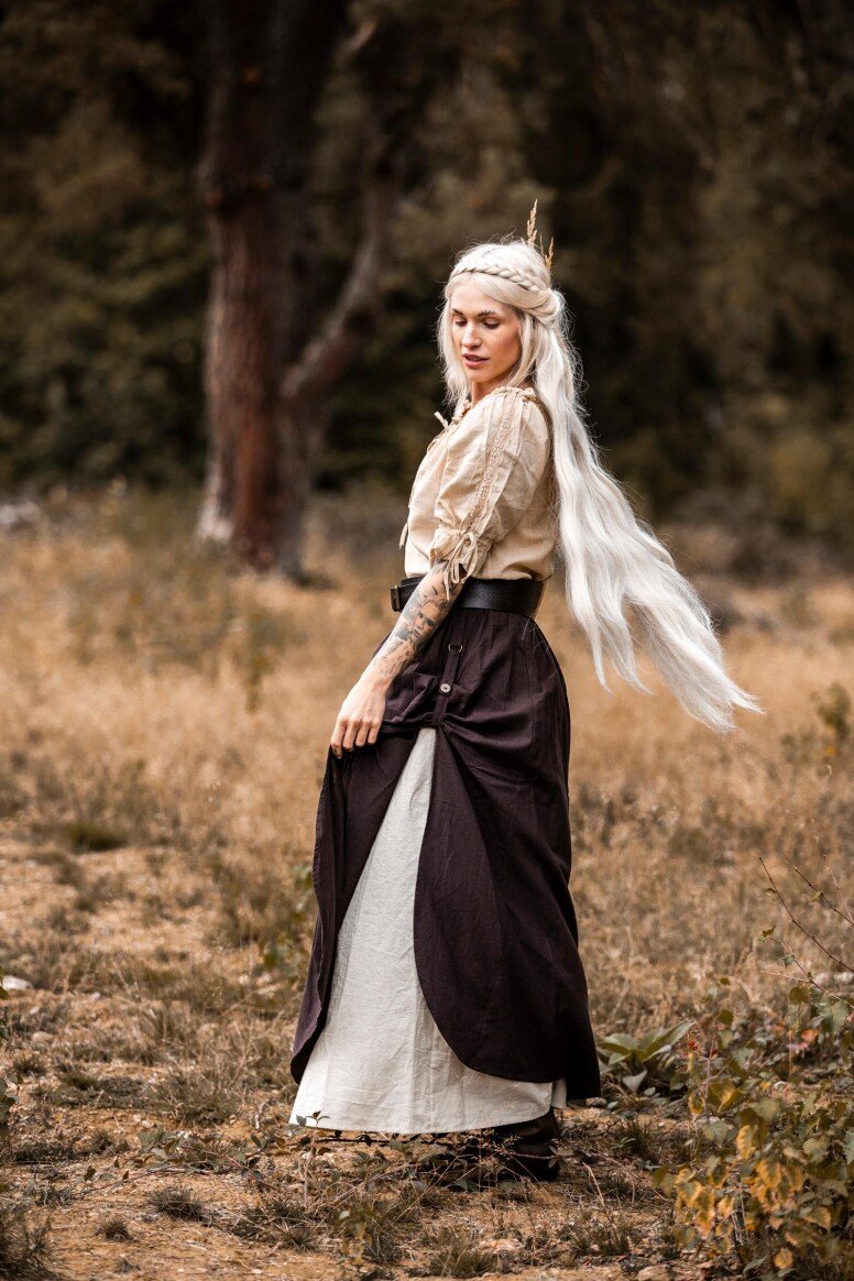 Inspirado en la época vikinga, este vestido refleja la artesanía detallada propia de aquellos tiempos, sin pretender ser una recreación fiel. Durante estas épocas, los vestidos largos eran símbolo de estatus y artesanía. Los bordados hechos a mano evocan el arte tradicional nórdico, simbolizando protección y buena fortuna para sus usuarios.