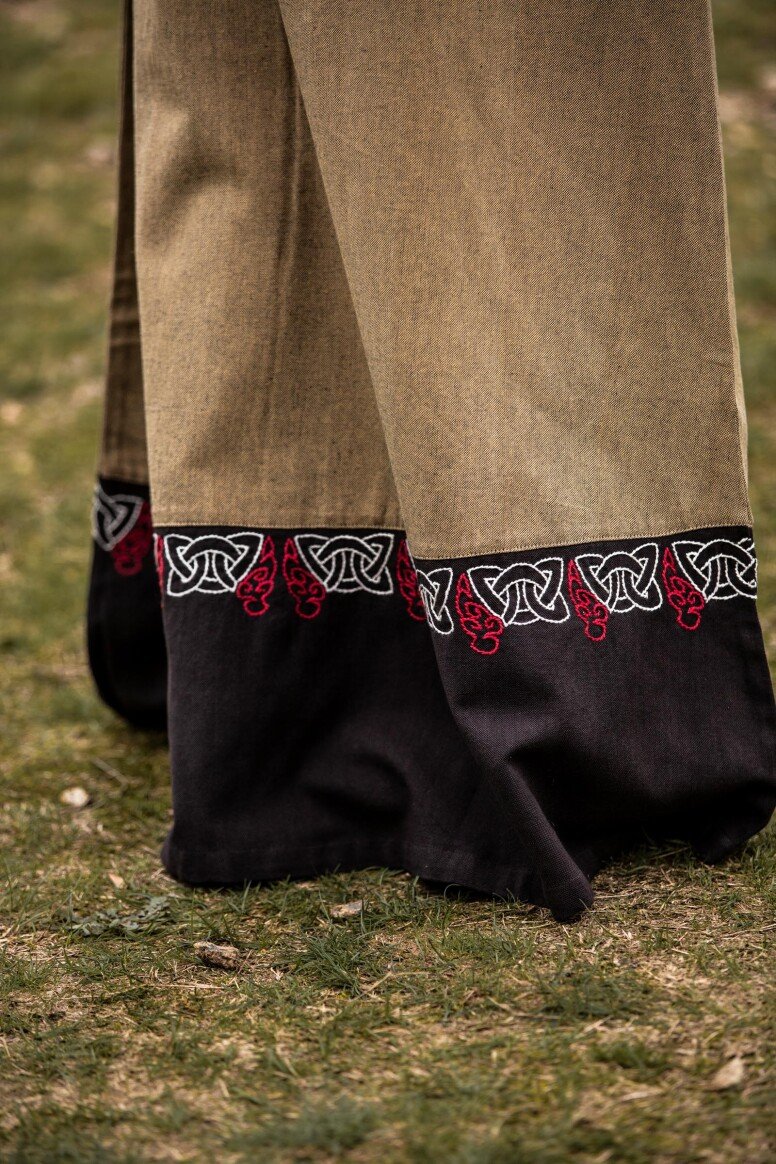 Nuestro Vestido Vikingo Mujer Idun con Bordados es una pieza que combina majestuosamente la simplicidad y el detalle. Con su silueta larga y fluida, este vestido se ajusta cómodamente gracias a su diseño de línea A. Las mangas largas terminan en puños anchos, mientras que el escote en V, adornado con intrincados bordados de patrones entrelazados, añade un toque sofisticado. Estos elegantes bordados se extienden hasta los puños y el dobladillo, creando un tema decorativo armonioso que realza un panel contrastante único.