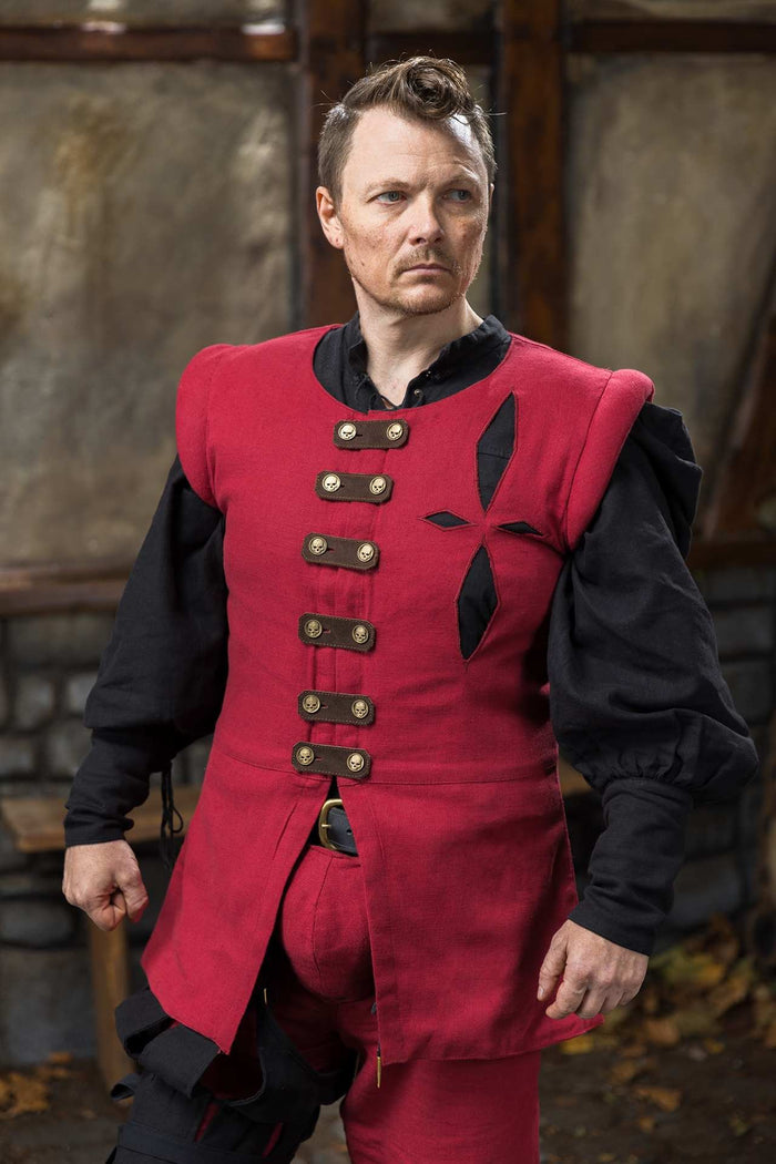 Descubre el Jerkin Imperial Warhammer Tipo A en Rojo Oscuro, una prenda lista para la batalla.