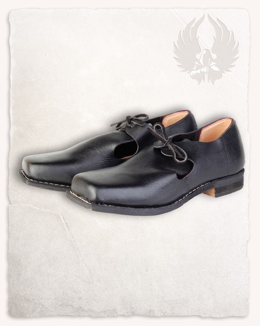 Los productos de cuero natural son muy duraderos y resistentes pero requieren un mantenimiento regular para mantenerlos flexibles y aumentar su vida útil. Asegúrese de que sus productos de cuero se mantengan libres de humedad cuando estén almacenados. Deje que el cuero mojado se seque naturalmente antes de tratar, o ayude a eliminar la humedad con una toalla o paño absorvente. Si el producto está frecuentemente húmedo y seco, aumente la frecuencia de mantenimiento. Para su limpieza recomendamos quitar la suciedad con un cepillo duro, luego frote suavemente con un paño limpio y húmedo hasta que el cuero se vea limpio y luego use un paño seco para limpiar el agua restante de la piel.Siempre debe acondicionar el cuero después de la limpieza, para ello recomendamos utilizar Grasa para Cuero Gold Quality, que puede ser adquirida en la sección de Mantenimiento. El modo de empleo consiste en aplicarla con un paño limpio, frotando suavemente una pequeña cantidad en círculos sobre el cuero. Deje que el cuero se empape de la grasa antes de limpiarlo con un paño limpio final para eliminar el exceso de residuos. Sigue estos consejos y tus productos de cuero seguirán como nuevos tras años de Rol en vivo (LARP).Descripción:Los Zapatos Gerard están hechos de cuero de gran calidad. La suela está bien cosida a la parte superior, el talón está pegado y luego clavado a la suela por medio de clavos de zapatero. Hecha con cuero endurecido, la suela ofrece un buen agarre en terrenos difíciles. Los cordones aprietan el zapato y lo mantienen bien agarrado dentro del talón.